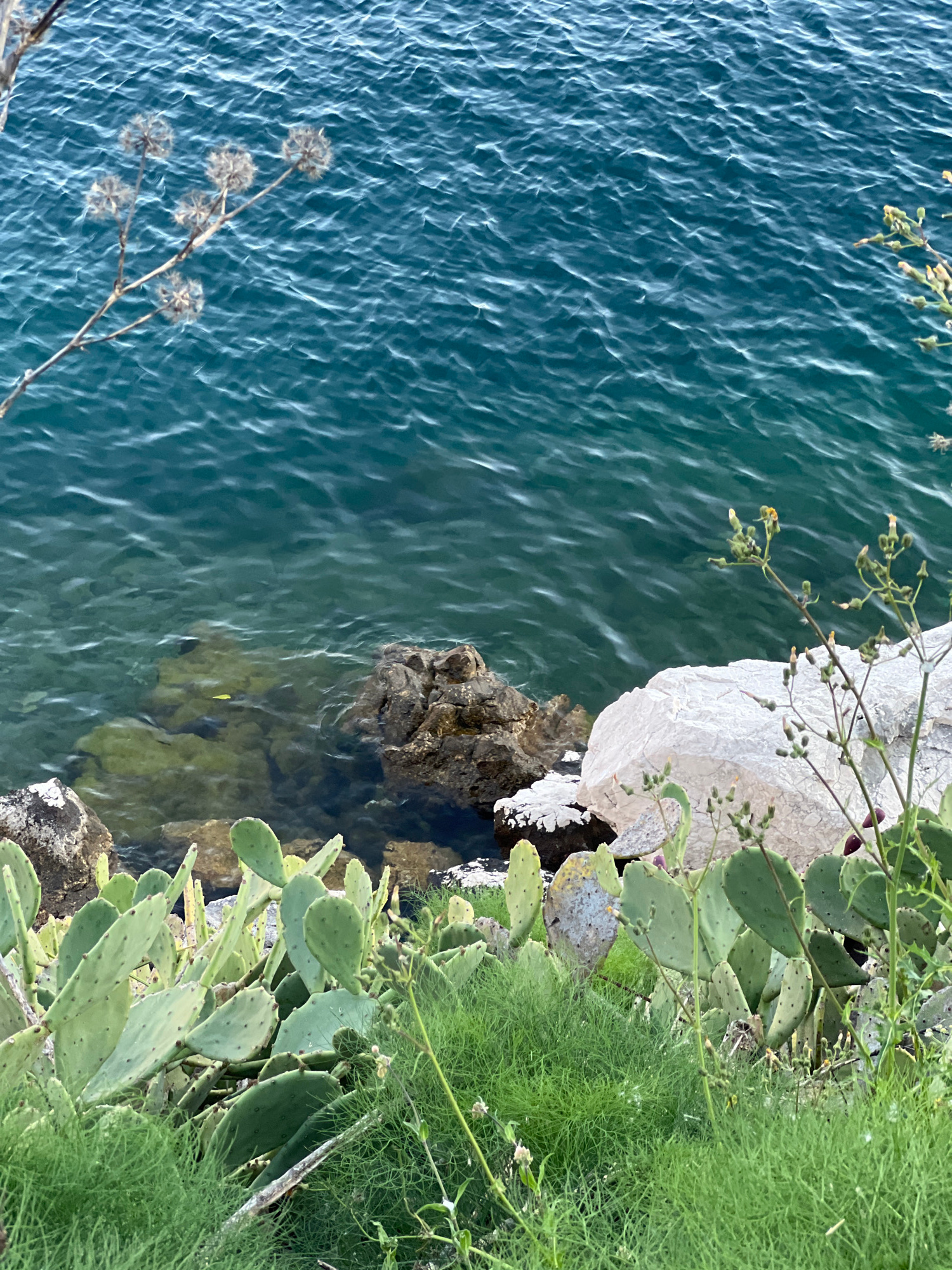 The image captures a scene in Donji Orahovac, Montenegro, featuring the coastline. The primary elements are the Adriatic Sea, rocky cliffs, and vegetation. The water is a deep blue-green, with visible…read more