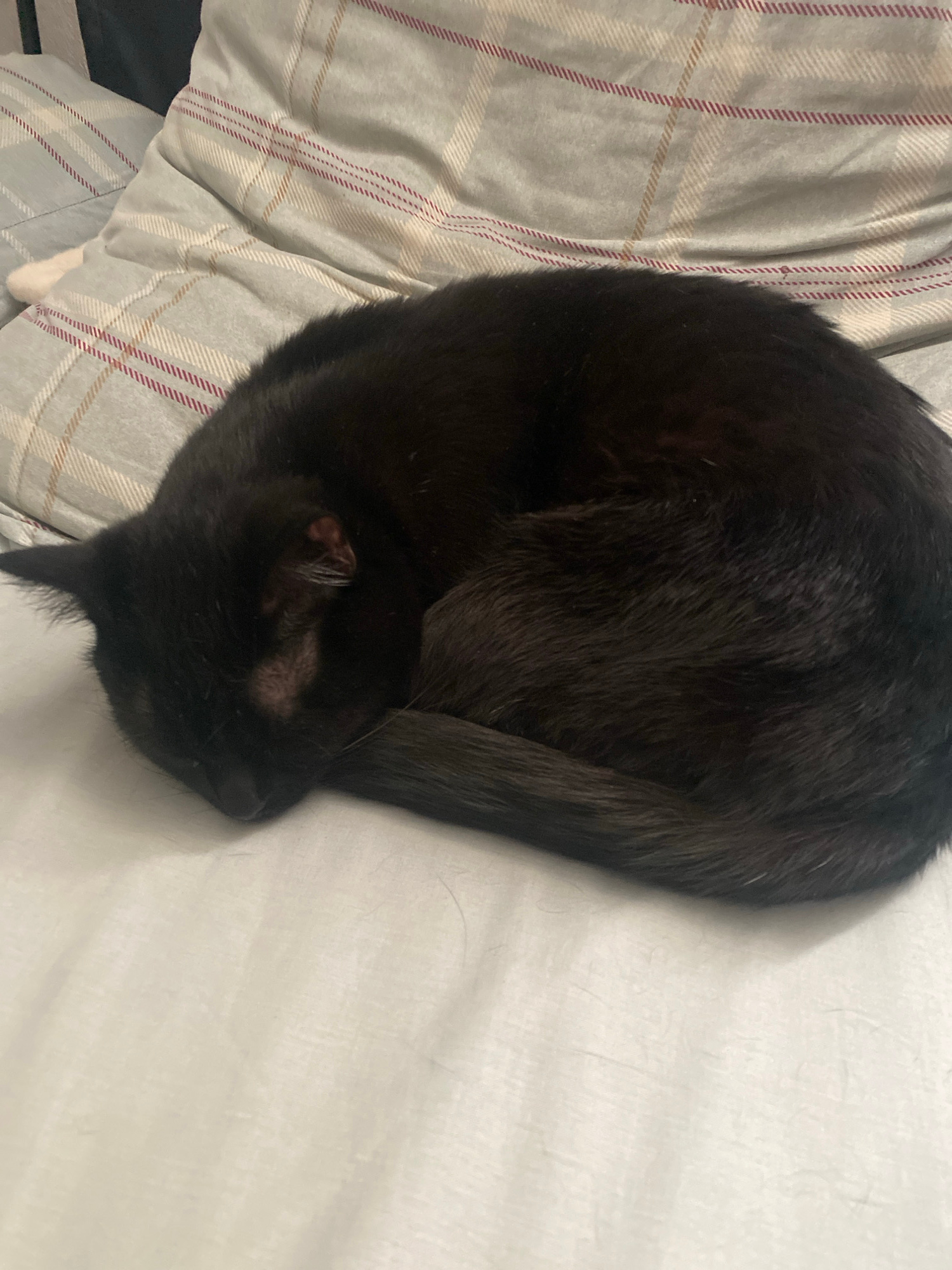 A black cat is curled up on a bed. The bed has a white sheet on the right and a gray, plaid sheet on the left. The cat's head is near the bottom of the image, and its tail is curled around its body. T…read more