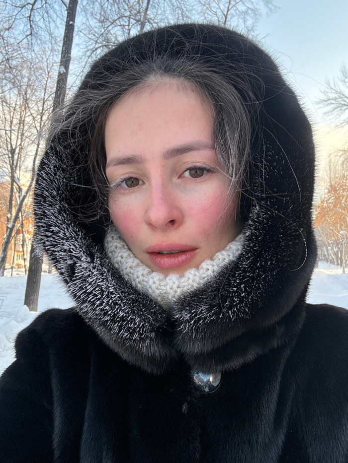A female subject, appearing to be approximately 20-30 years old, is depicted in a close-up, head-and-shoulders portrait against a winter outdoor backdrop in Yekaterinburg, Russia. She looks directly a…read more