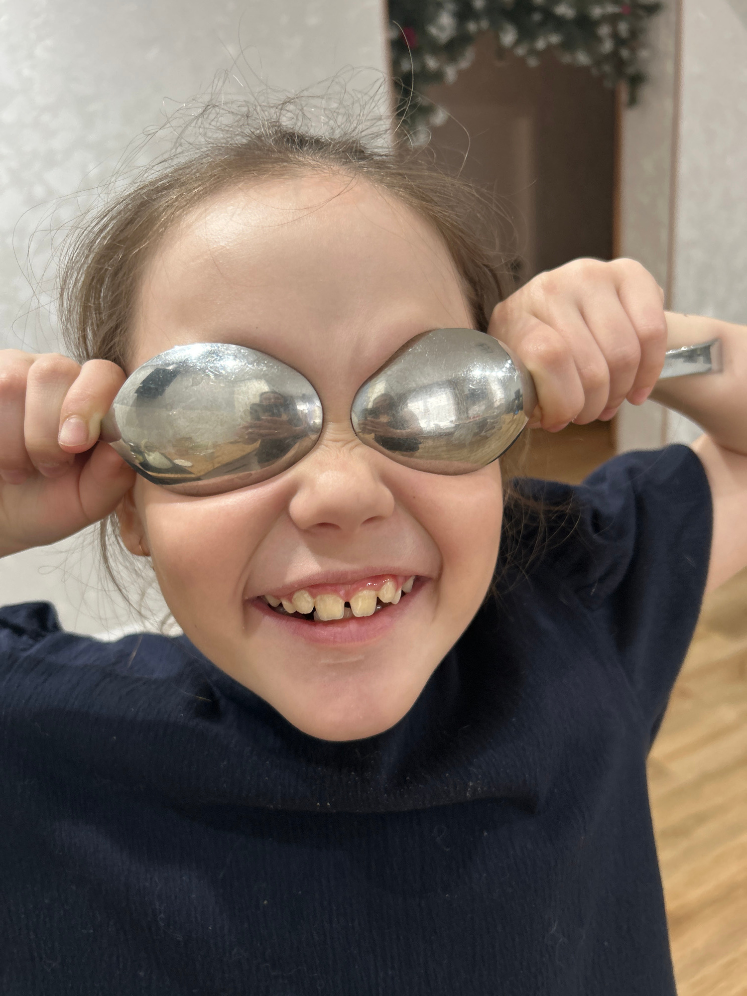 A child with fair skin and light brown hair is holding two silver spoons to their eyes and smiling. They are wearing a dark blue shirt. The background includes a white wall, a wooden surface, and a bl…read more