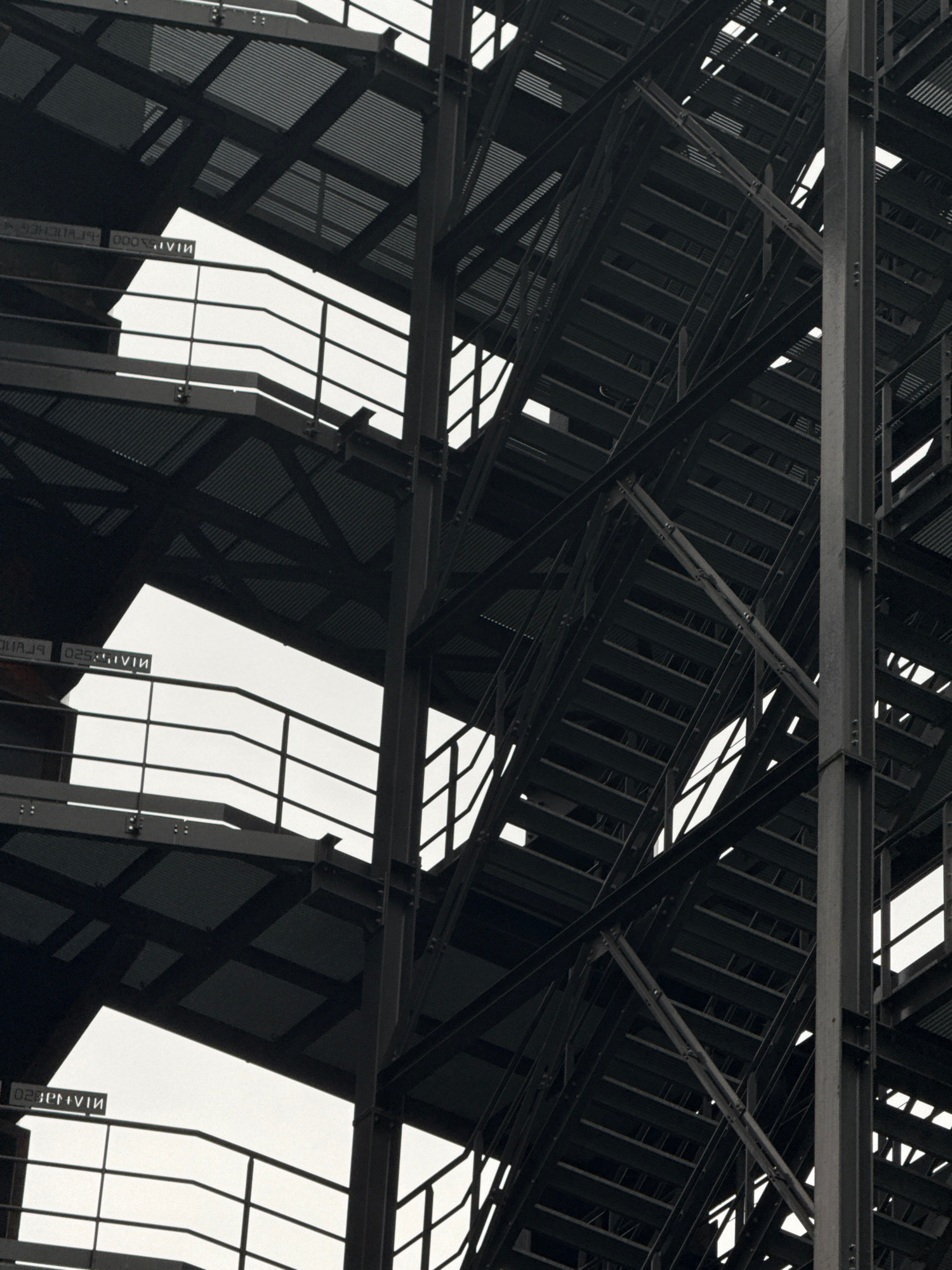 The image presents a detailed, high-contrast view of a robust, multi-level outdoor industrial steel structure, located in Esch-sur-Alzette, Luxembourg. The scene is dominated by a complex interplay of…read more