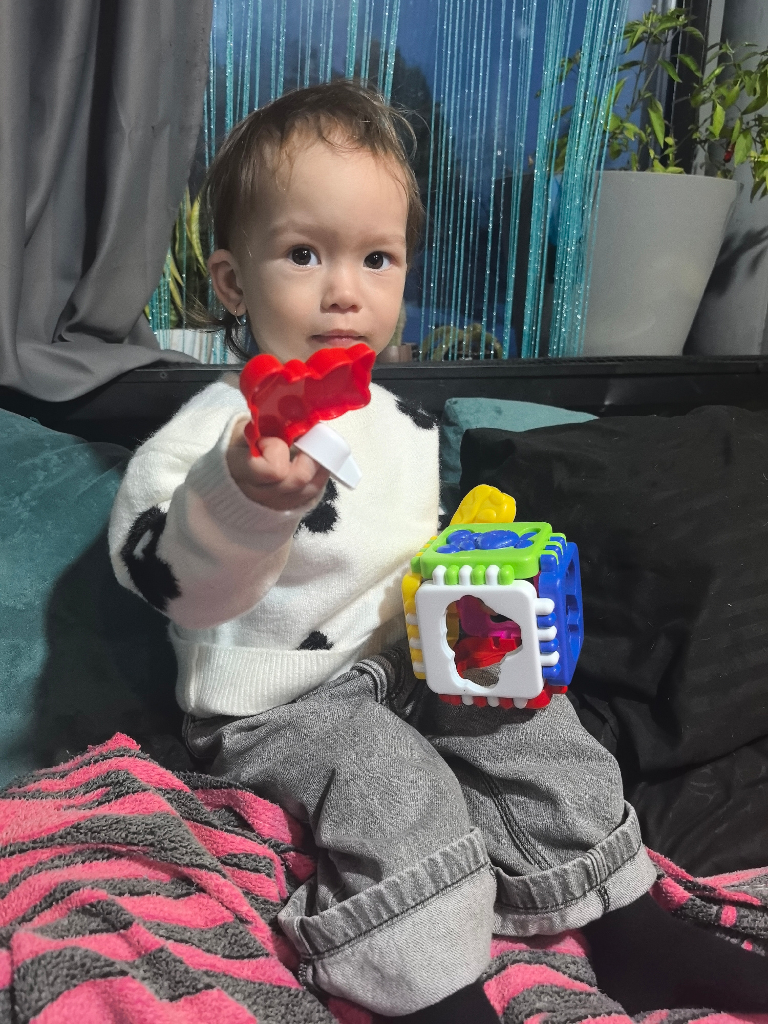 A young child, approximately a toddler, is depicted seated indoors, looking directly forward. The child has light brown hair and dark eyes, wearing a white long-sleeved sweater with black patterns and…read more