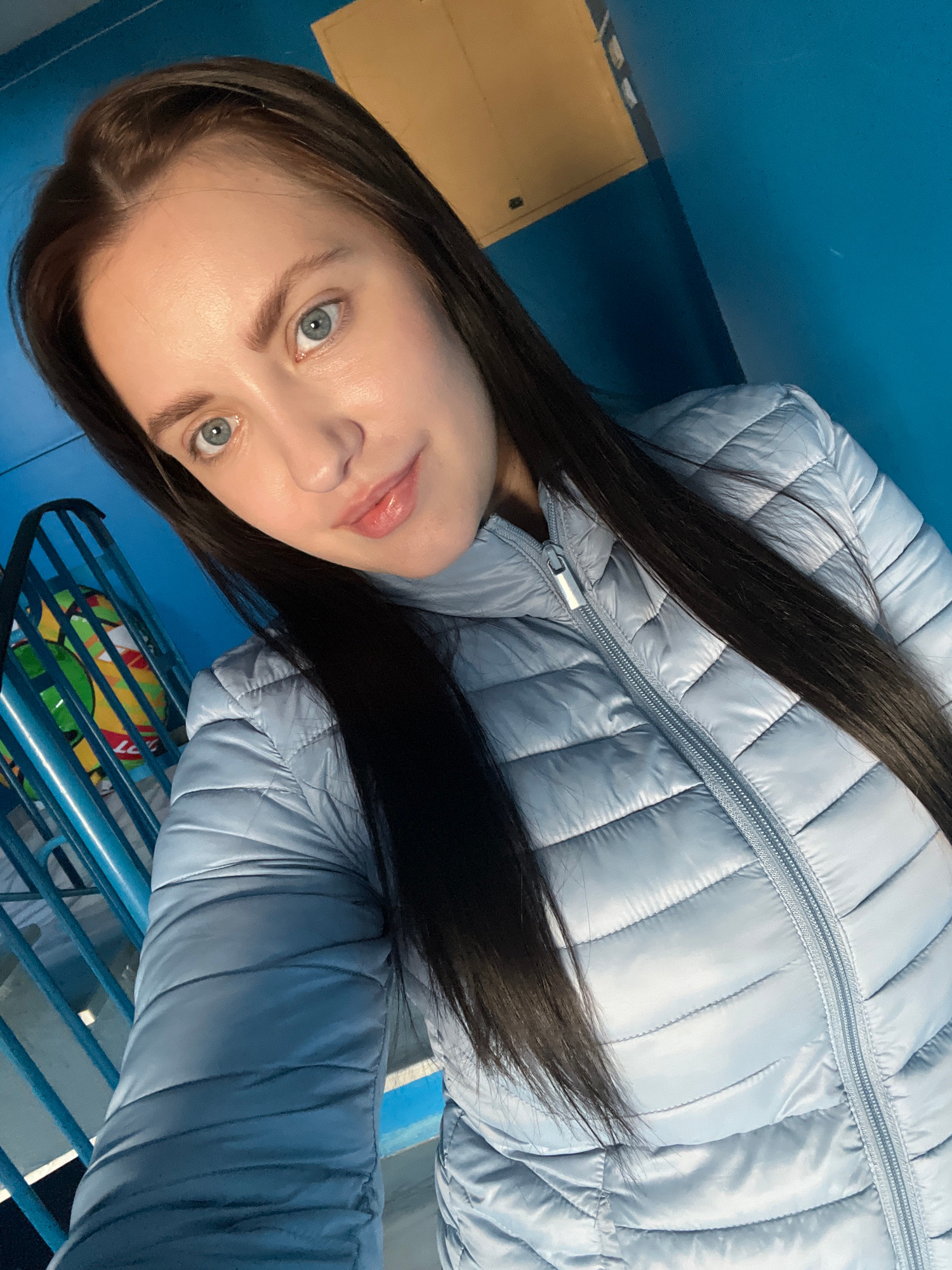 A woman with long dark hair and light blue eyes is looking at the camera. She is wearing a light blue quilted jacket. The background is a blue wall and floor with a yellow box in the corner. There is…read more