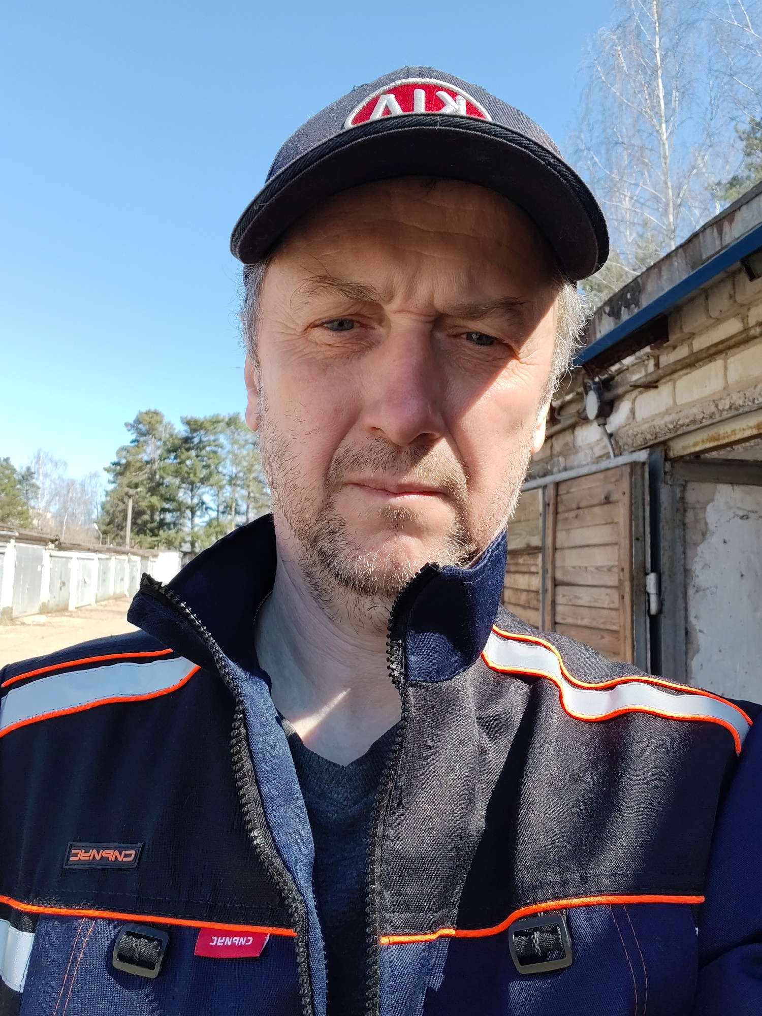 A middle-aged man with a light beard and wearing a dark baseball cap with the letters "AVK" in red and white, and a dark blue jacket with orange and white reflective stripes, poses for a selfie. The j…read more