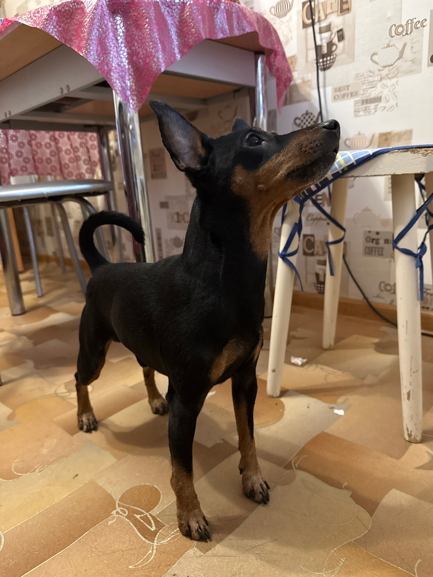 A small, black and tan dog, possibly a Dachshund or a similar mixed breed, stands indoors on a patterned floor, looking upwards and to its left with an inquisitive expression. The dog has short, sleekβ¦read more