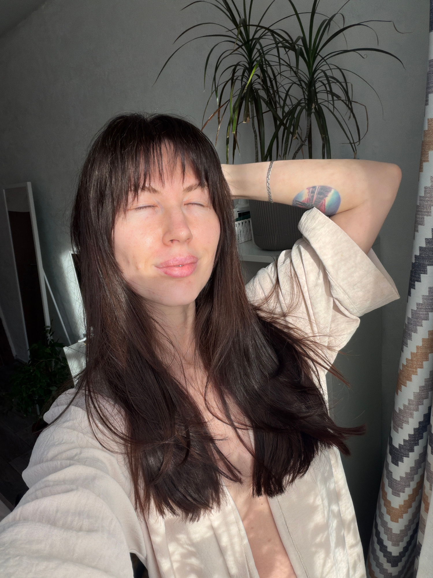 A woman with brown hair and a tattoo on her arm is lying down near a window, possibly in Perm, Russia. A plant is also visible near the window. The woman is wearing a light-colored shirt.