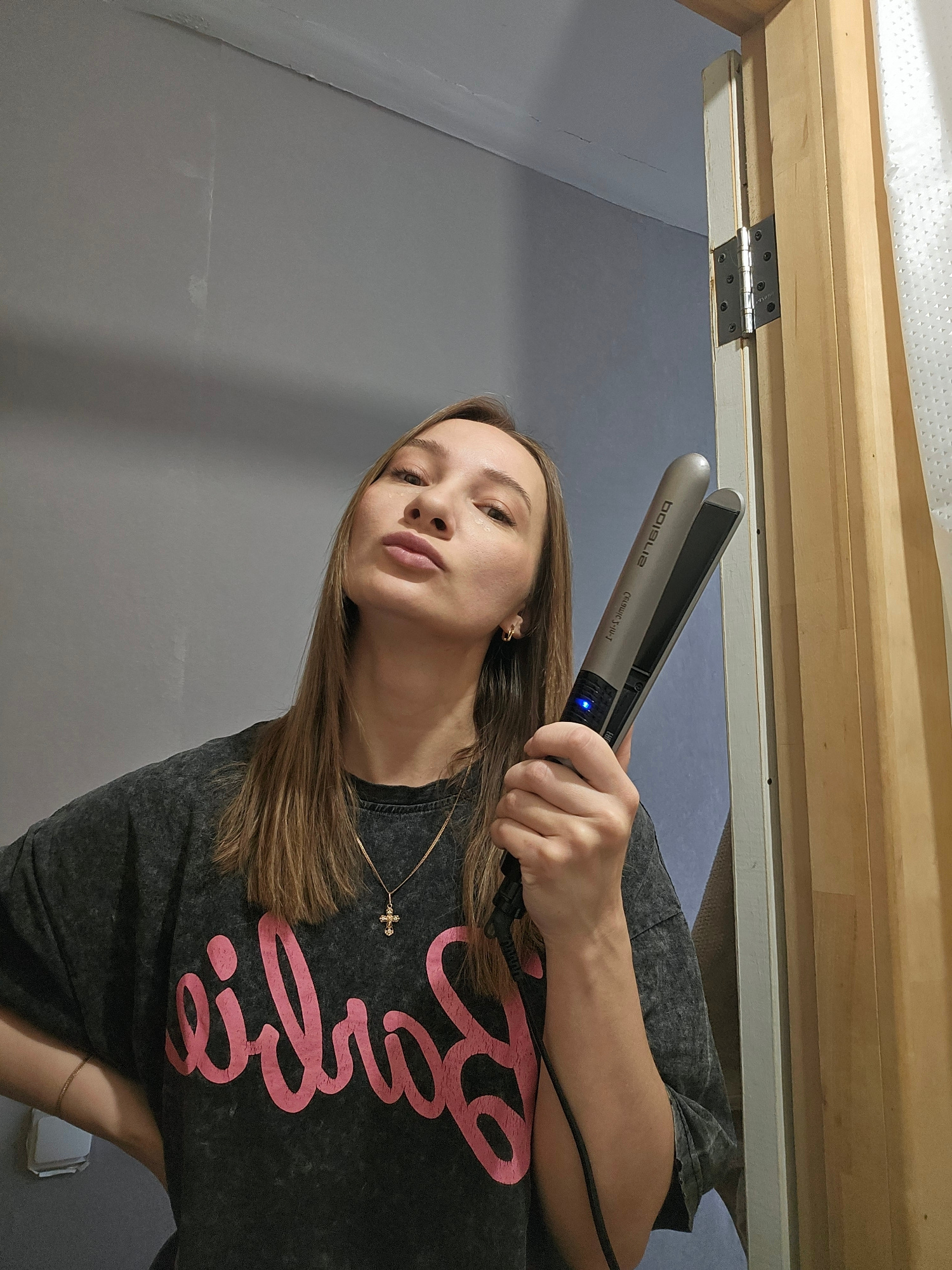 The image captures a young female indoors, holding a hair straightener. She has light brown hair and wears a dark gray t-shirt with the word "Barbie" printed in large pink script across the chest. A g…read more
