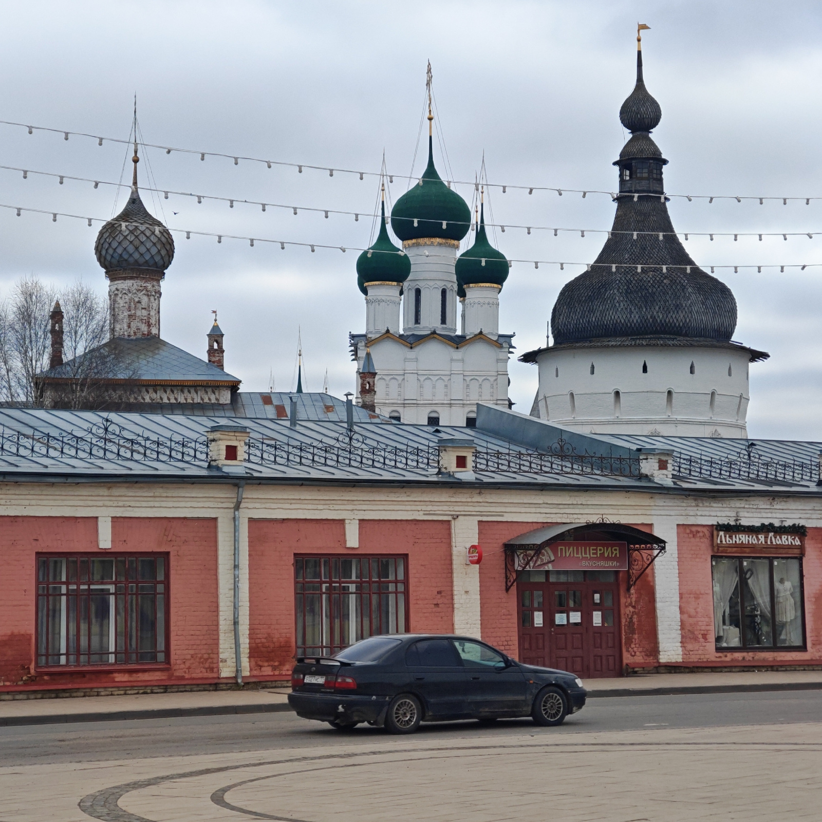 The image shows a street scene in Rostov, Russia, featuring several architectural landmarks. In the foreground is a red brick building with a gray roof and windows with dark frames. Signage is visible…read more