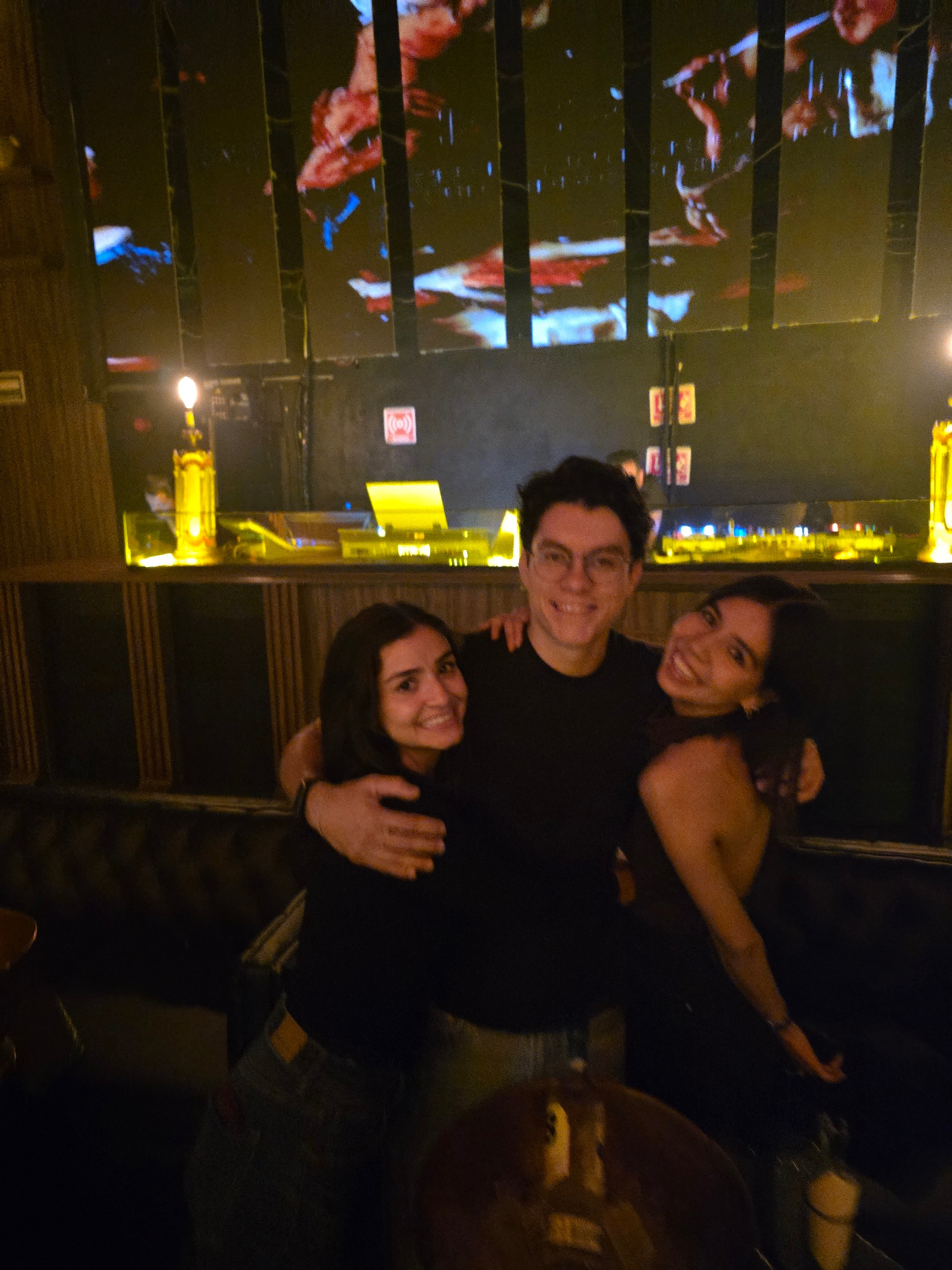 Three individuals are grouped together in what appears to be an indoor venue with low lighting. The setting is a bar or entertainment space, indicated by wall-mounted displays and accent lighting. A m…read more
