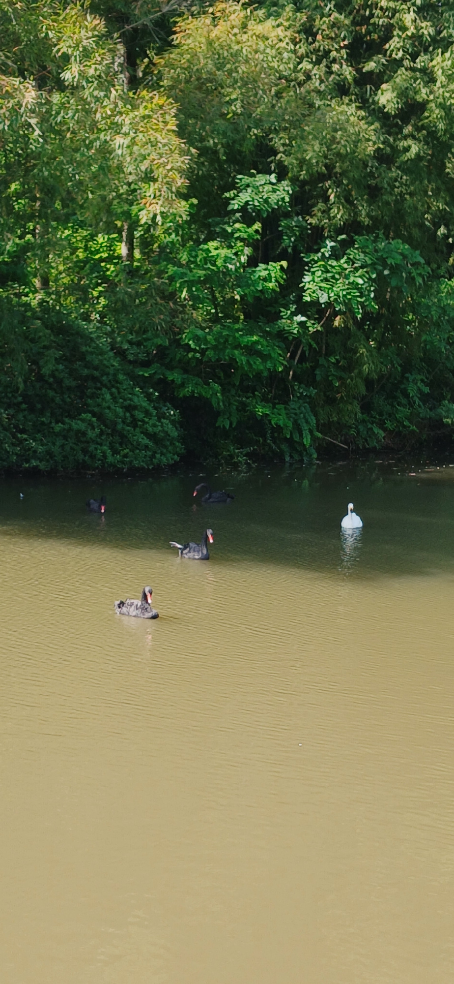 This aerial or high-angle photograph captures a natural scene, divided between a lush green bank on the left and a body of water on the right, under bright daylight conditions. The left side of the f…read more