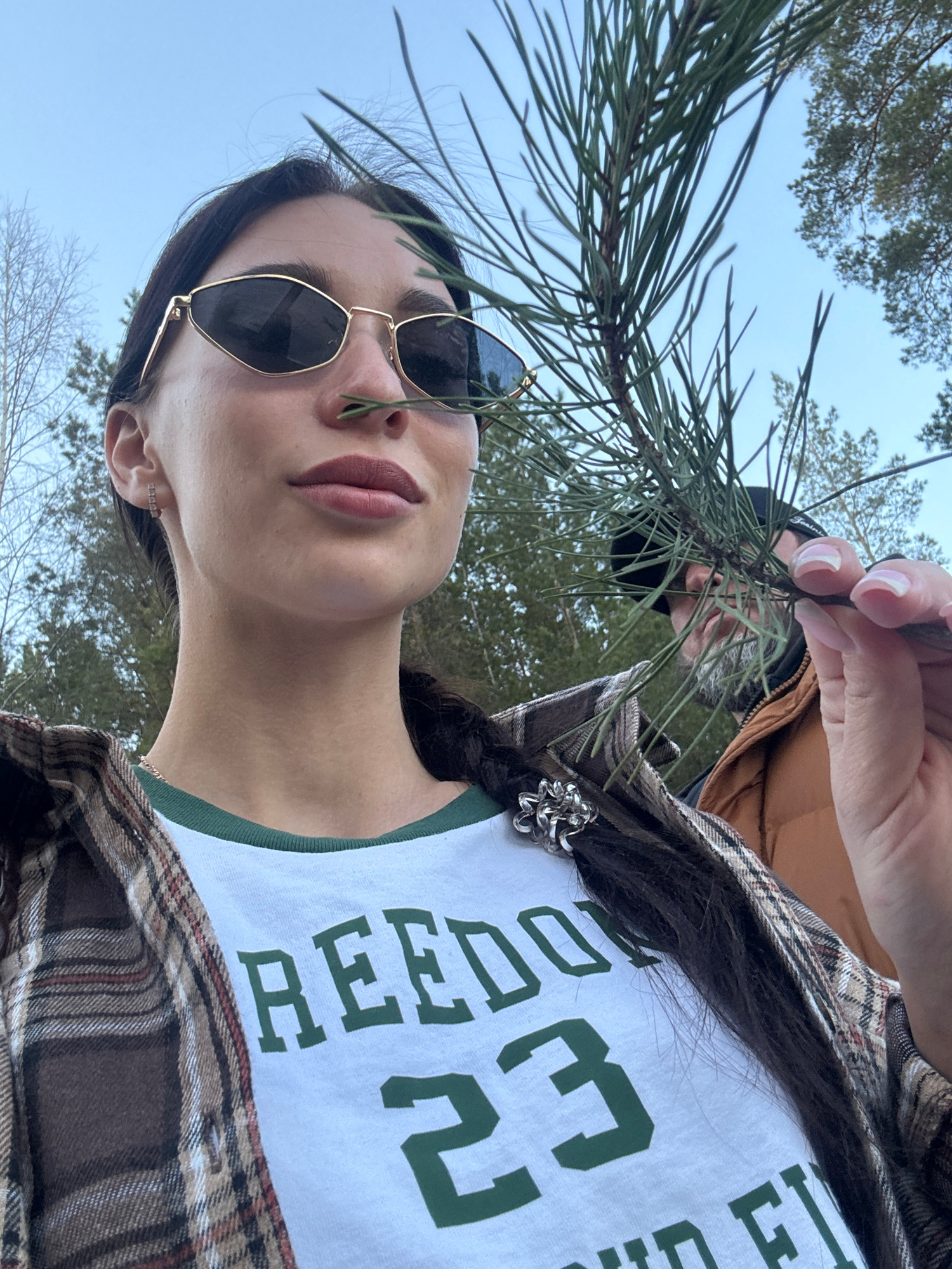A low-angle shot shows a woman outdoors, holding a pine branch in front of her face. She wears sunglasses with gold frames. The woman has dark hair, partly braided and adorned with a silver hair acces…read more