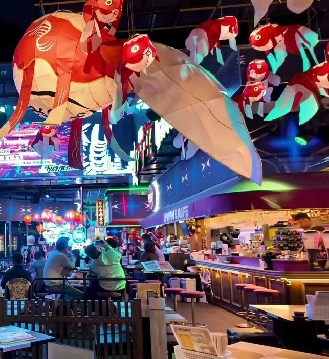 The image displays an interior view of a commercial establishment in Shinjuku, Japan, observed at night. Overhead, numerous large, stylized paper lanterns shaped like red and white goldfish are suspen…read more
