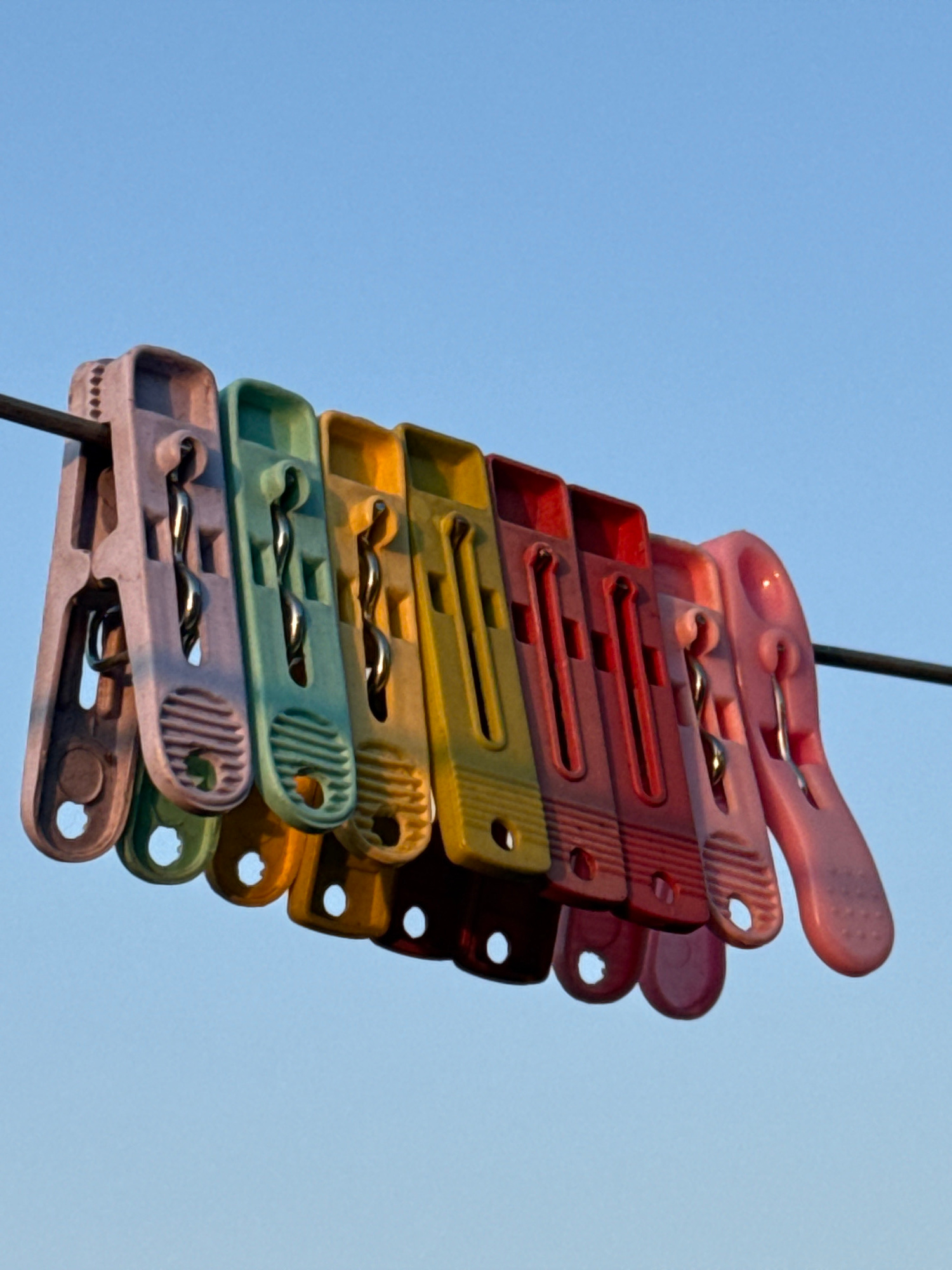 The image shows a stack of colorful plastic clothespins hanging on a wire. The clothespins are arranged vertically, and their colors include pink, red, yellow, green, and purple. The background is a c…read more