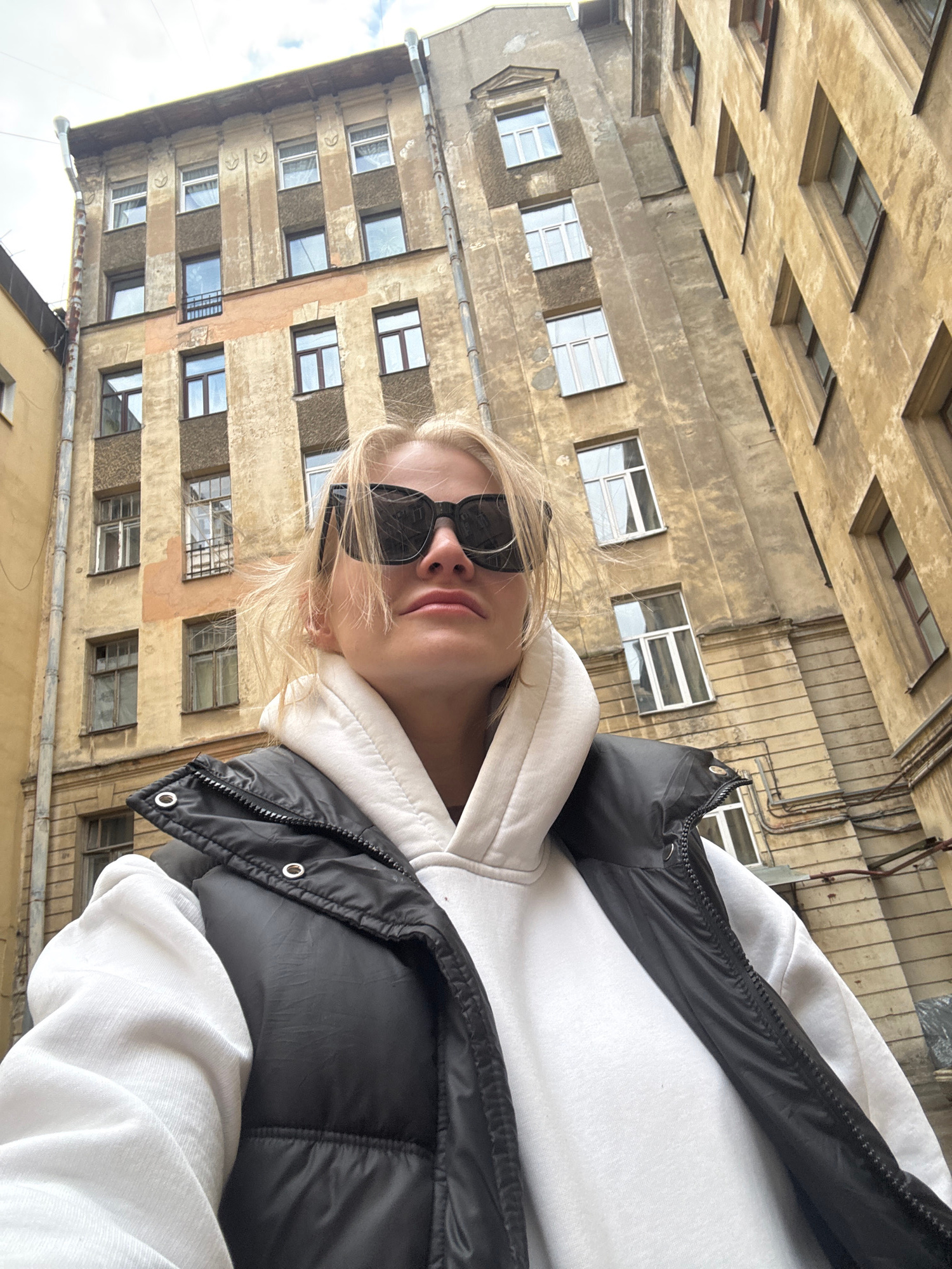 The image presents a selfie of a young blonde woman against the backdrop of an old urban building. The image is oriented with the building appearing horizontal, but when mentally rotated, it shows a multi-story facade towering behind the subject. The central subject is a woman with blonde hair, fair skin, and full lips, wearing dark, rectangular sunglasses that cover her eyes. She is dressed in a white hooded sweatshirt layered under a black sleeveless puffer vest. The zipper and some metallic accents on the vest are visible. Her expression is neutral, possibly casual, enhanced by the sunglasses. She appears to be holding the camera herself, looking directly into the lens from a slight upward angle, consistent with taking a selfie. The background features a densely built, aged building, characteristic of European urban architecture. The facade is a light, somewhat faded beige or ochre color, showing signs of wear and historical weathering. Numerous rectangular windows with distinct dark frames are distributed across its multiple floors. Some windows reflect the sky, while others reveal interior darkness. Architectural details include horizontal banding between floors and visible conduits or drainpipes running down parts of the building. The sky, visible in the upper left (when correctly oriented), appears bright but possibly overcast, suggesting daytime. The location context specifies Saint Petersburg, Russia, and the architectural style of the building with its weathered facade and dense window arrangement aligns with typical older residential or commercial buildings found in that city. There is no visible text in the image. | Open Wire