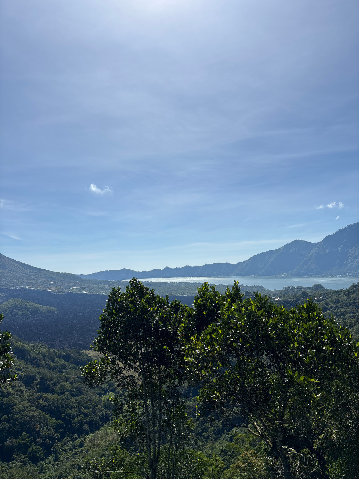 The image depicts a landscape view in Kintamani, Indonesia. A clear, blue sky with some wispy clouds is overhead. In the distance, there is a body of water, possibly a lake, bordered by mountains that…read more
