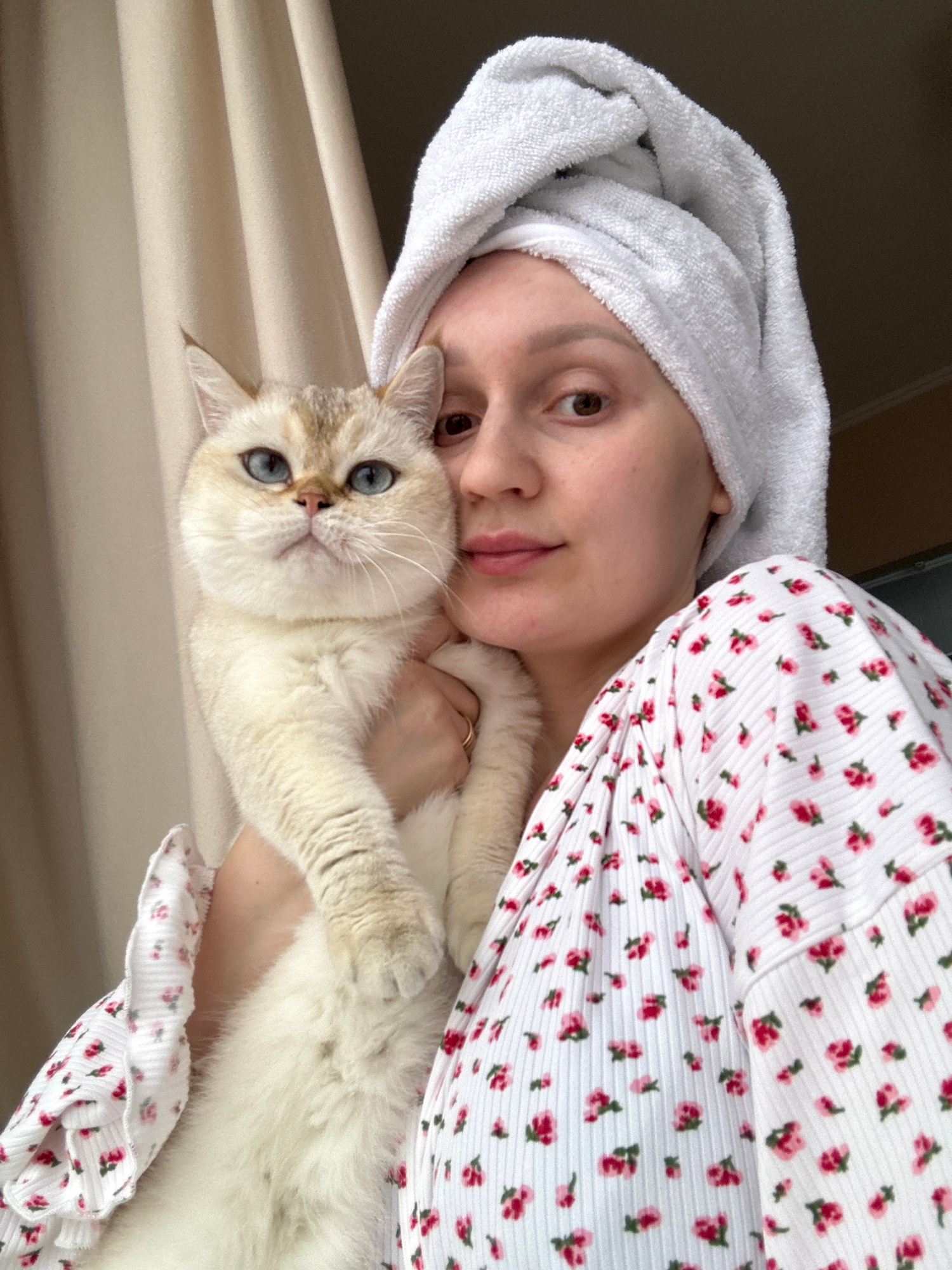 A selfie shows a woman holding a cat. The woman has a white towel wrapped around her head and is wearing a white, long-sleeved, floral-patterned shirt. She is looking directly at the camera with a sli…read more