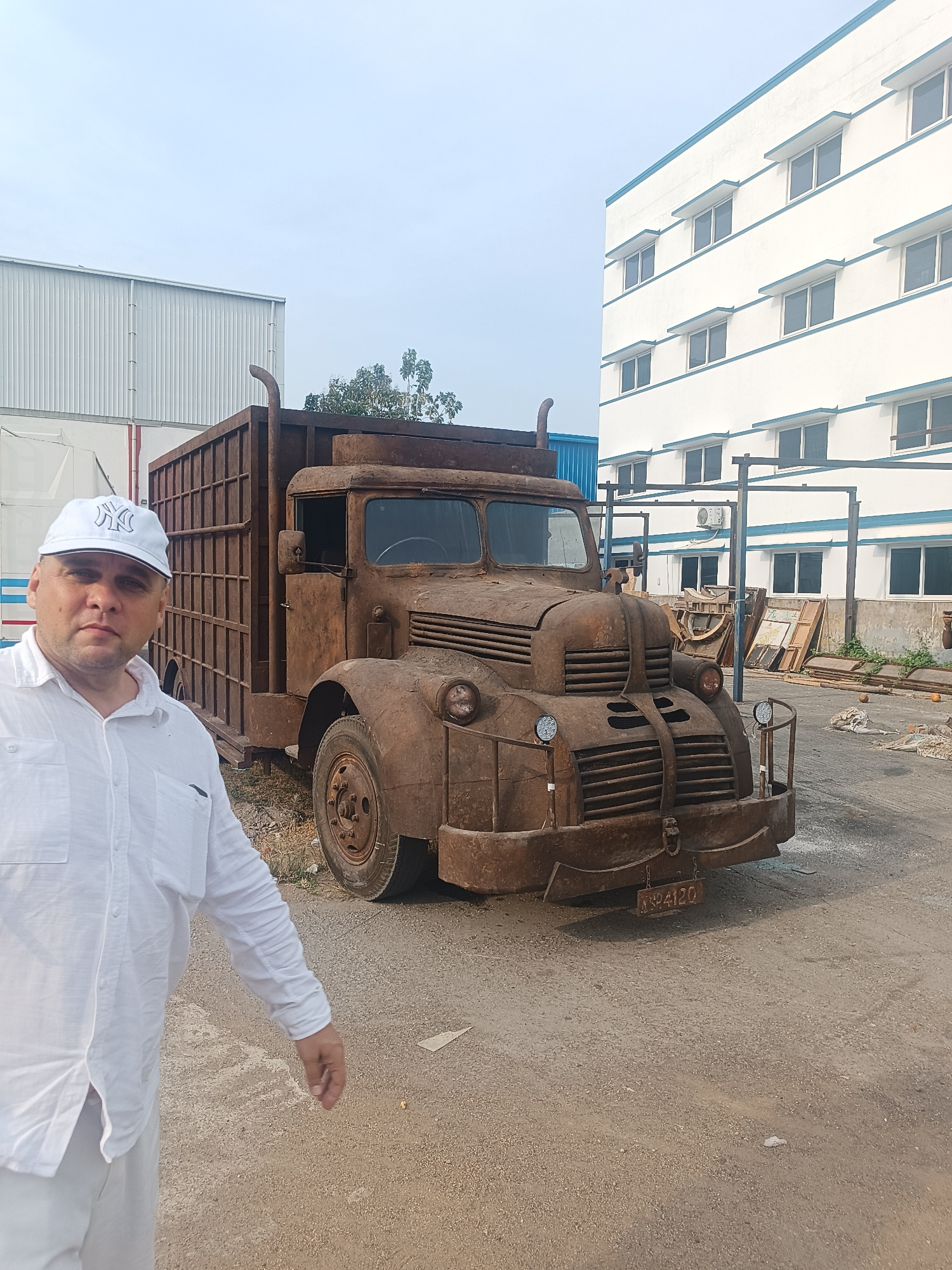 A man in a white baseball cap and white button-down shirt stands to the left of a heavily rusted, vintage truck with a cage-like back. The truck is parked on an asphalt surface. In the background, theβ¦read more