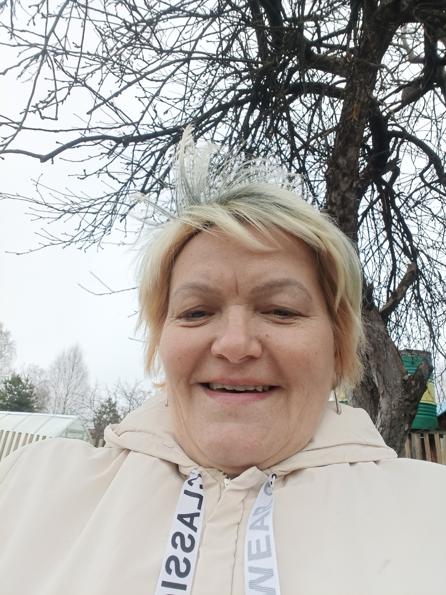 A close-up selfie depicts a smiling older woman with short, light blonde hair in an outdoor setting. She is wearing a light beige hooded jacket with the word "CLASSIC" repeatedly printed on the drawst…read more