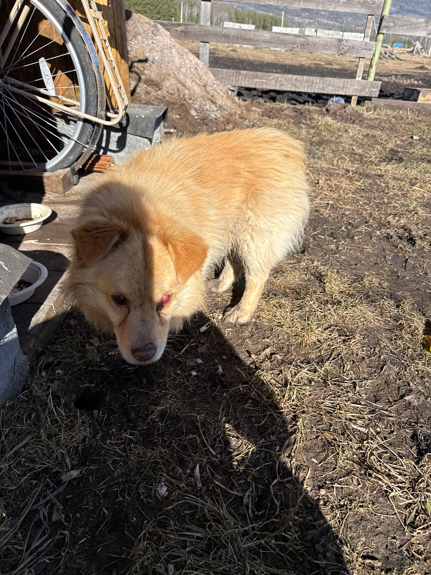 A medium, tan-colored dog stands on a surface of rough-hewn wood and weathered concrete. A bicycle wheel and frame rest nearby. The backdrop includes a grassy area with patches of bare earth, and frag…read more