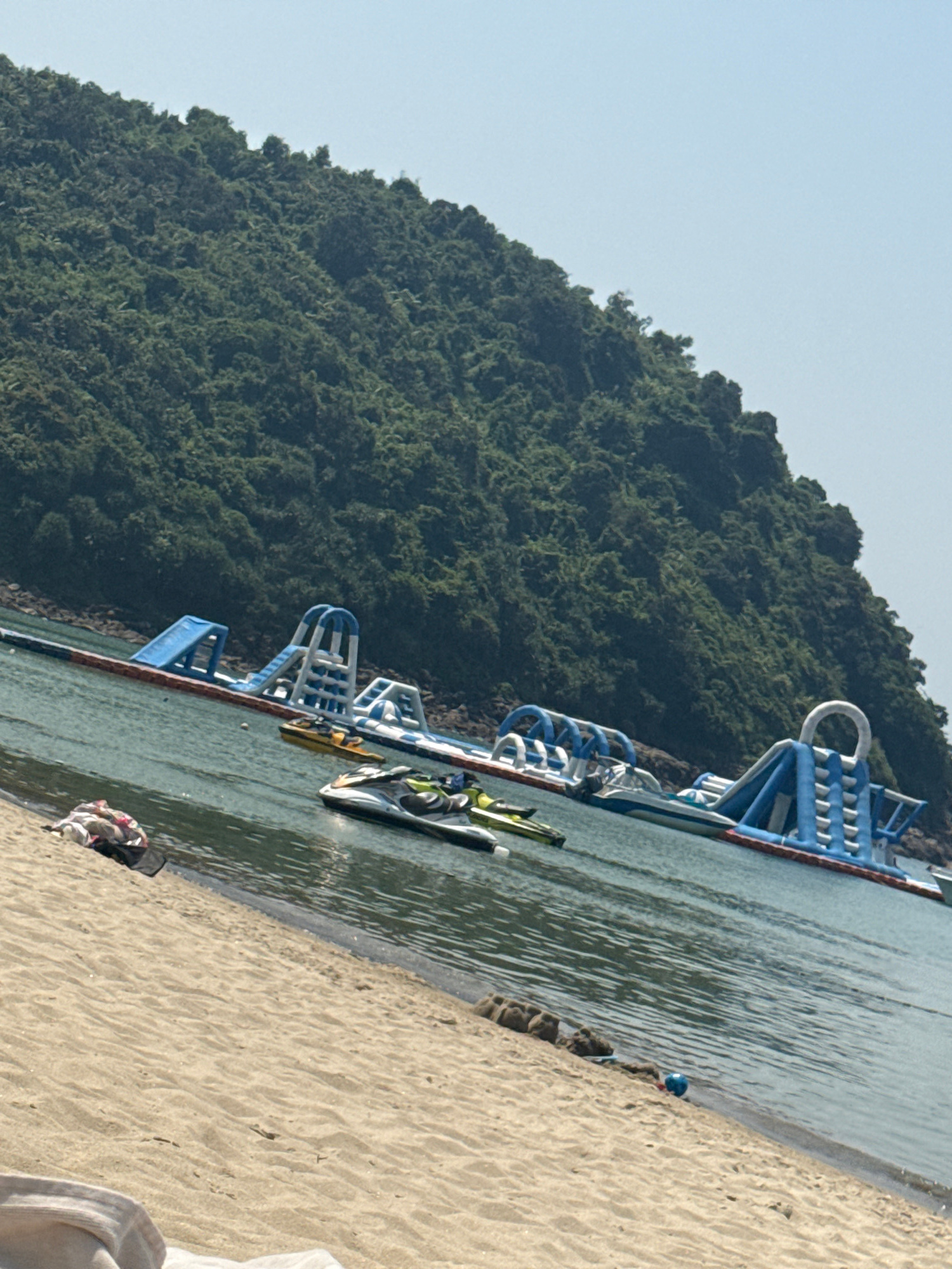 The image displays a sunny coastal scene in Đà Nẵng, Vietnam, specifically identifiable as part of the Sơn Trà Peninsula area due to the distinctive heavily forested mountain meeting the sea. The fore…read more