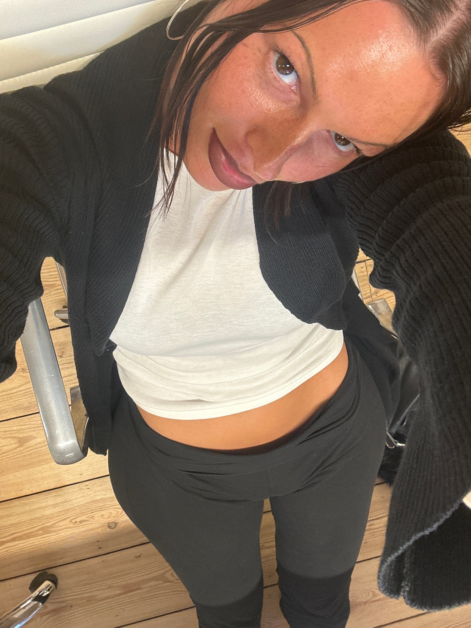 A woman takes a selfie in an indoor setting in London, United Kingdom, captured from a tilted, overhead perspective. She gazes directly into the camera with a neutral expression. Her dark hair is styl…read more