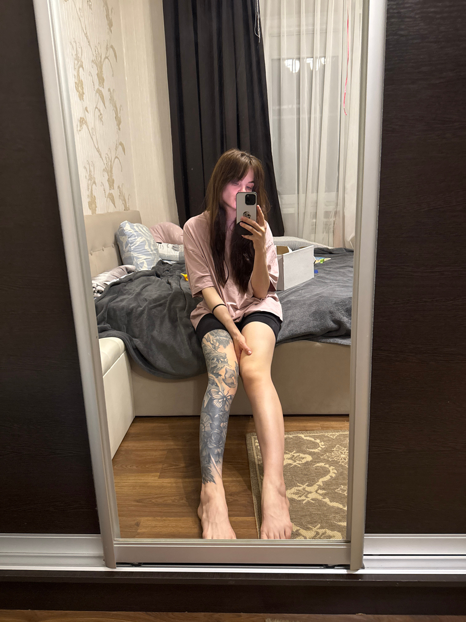 The image is a mirror selfie of a woman indoors. She is wearing a light pink top and black shorts. Her left leg is extended towards the viewer, revealing a tattoo sleeve. She is sitting on a beige cou…read more