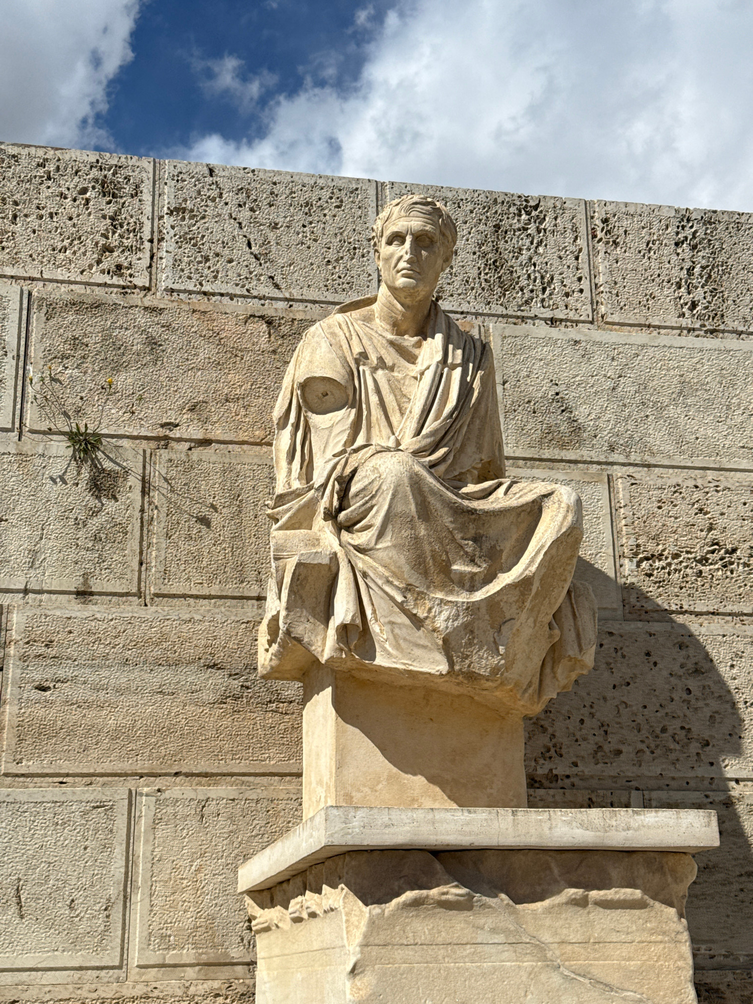 Close-up shot of a weathered, light-stone sculpture depicting a human figure draped in fabric. The sculpture is mounted on a building exterior constructed from similarly textured stone blocks, locatedβ¦read more