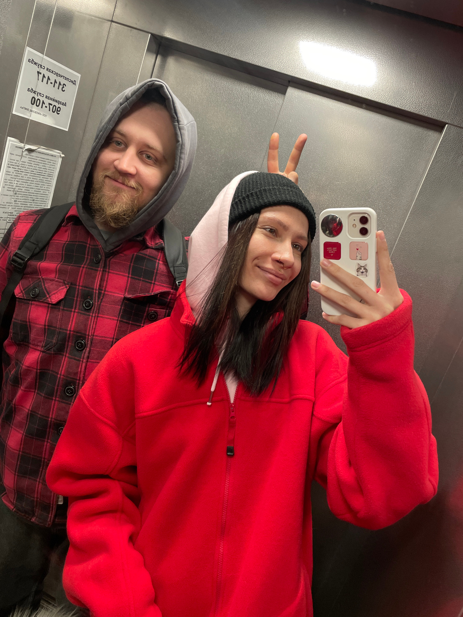 A photograph, rotated counter-clockwise, shows two individuals in what appears to be an elevator in Izhevsk, Russia. The woman, wearing a red hooded fleece jacket and a black beanie, holds up a smartp…read more