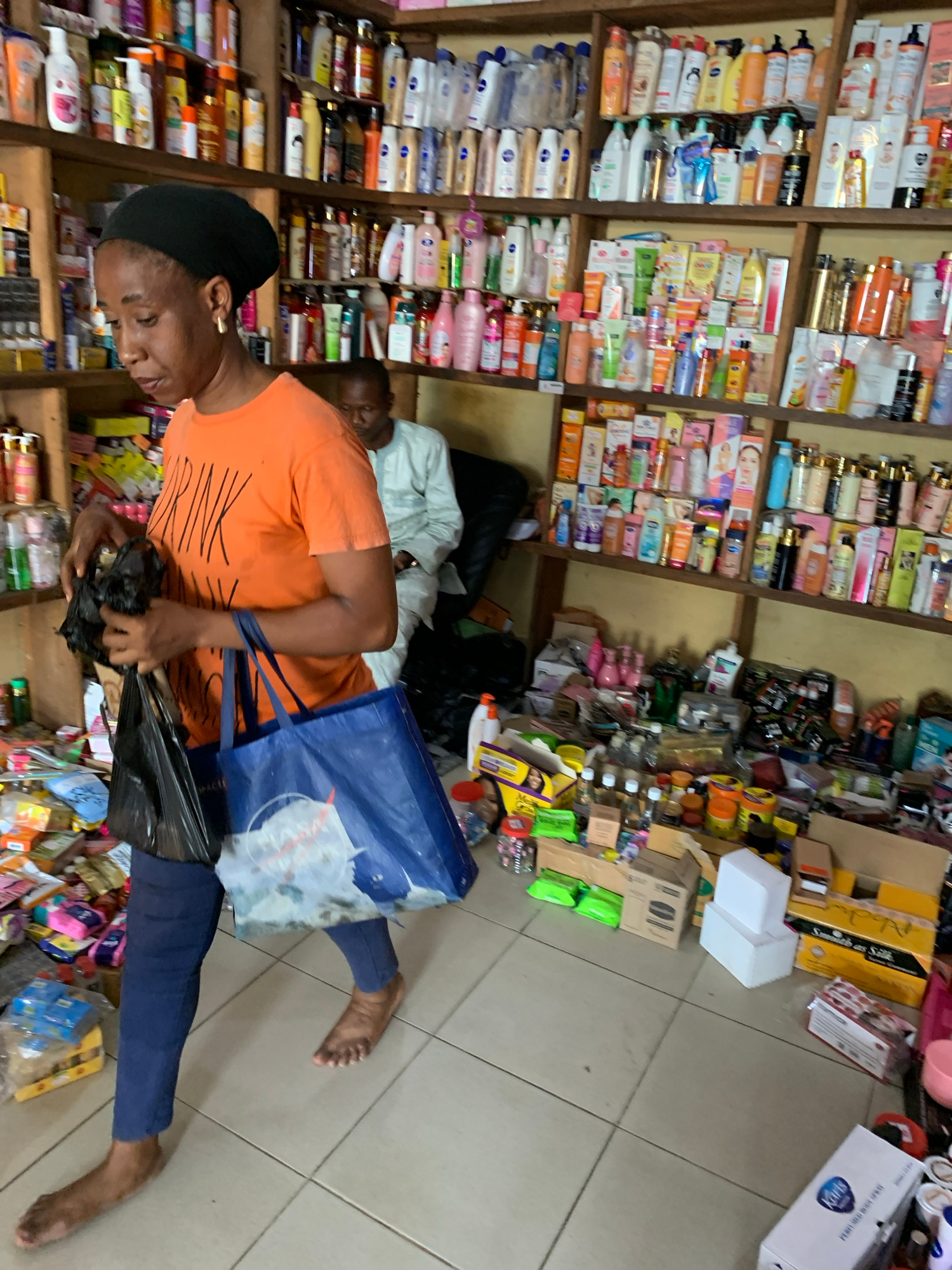 The image shows the interior of a store in Keffi, Nigeria. The store is stocked with shelves full of personal care products. A woman is standing in the aisle, holding a black plastic bag and a blue sh…read more