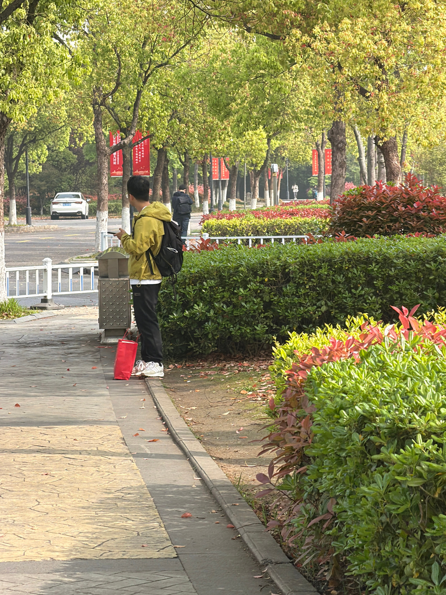 The image depicts a tree-lined street or pathway in Jiangning District, China, on what appears to be a bright, possibly overcast, daytime. The overall scene is characterized by lush greenery, with num…read more