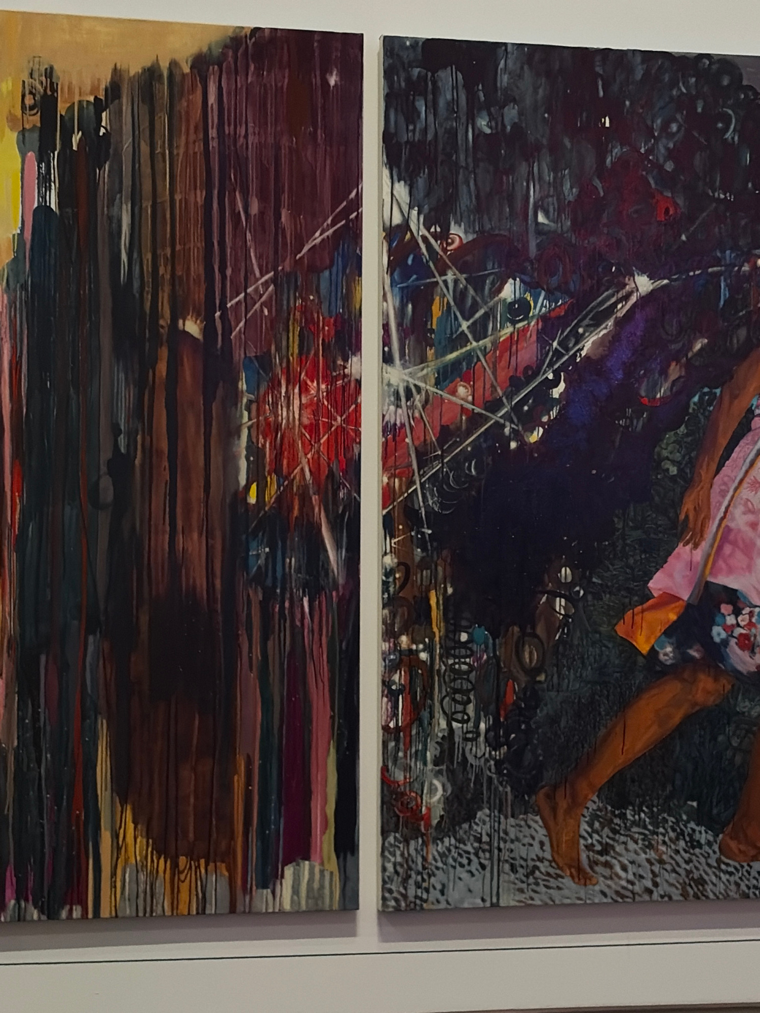 Two abstract paintings hang on a white wall. The top painting features a figure with brown skin, wearing a pink and floral garment. The figure's arms and legs are visible, along with an orange piece o…read more