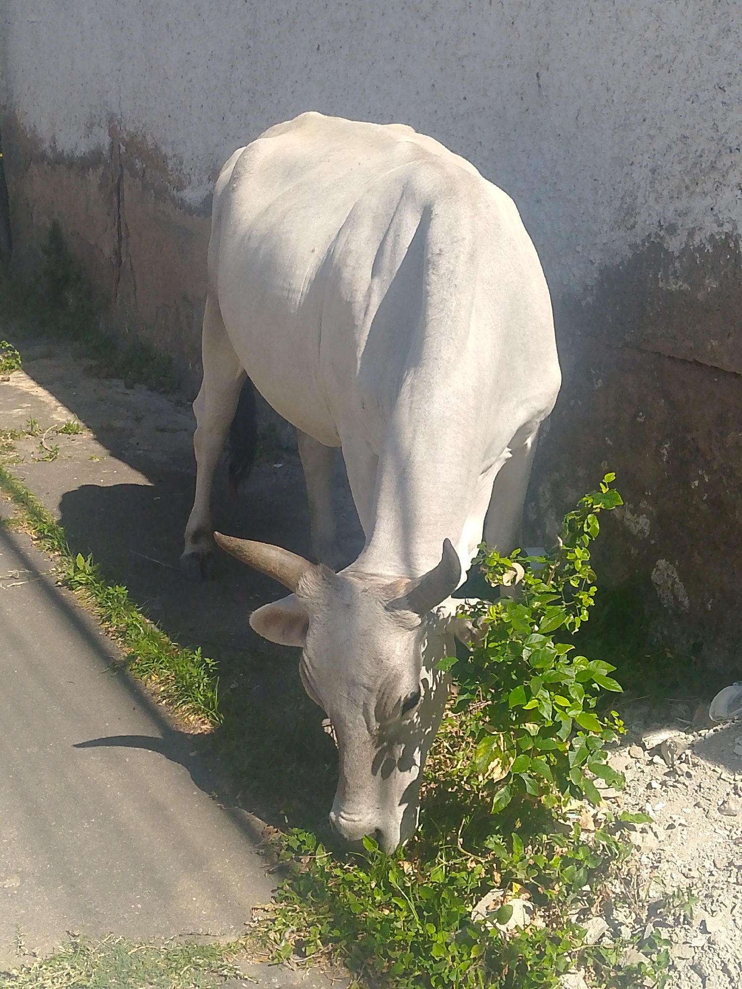 A white cow is grazing on vegetation growing between a sidewalk and a wall in what appears to be an urban environment. The cow has horns and is facing downward towards the ground. The wall is weathere…read more