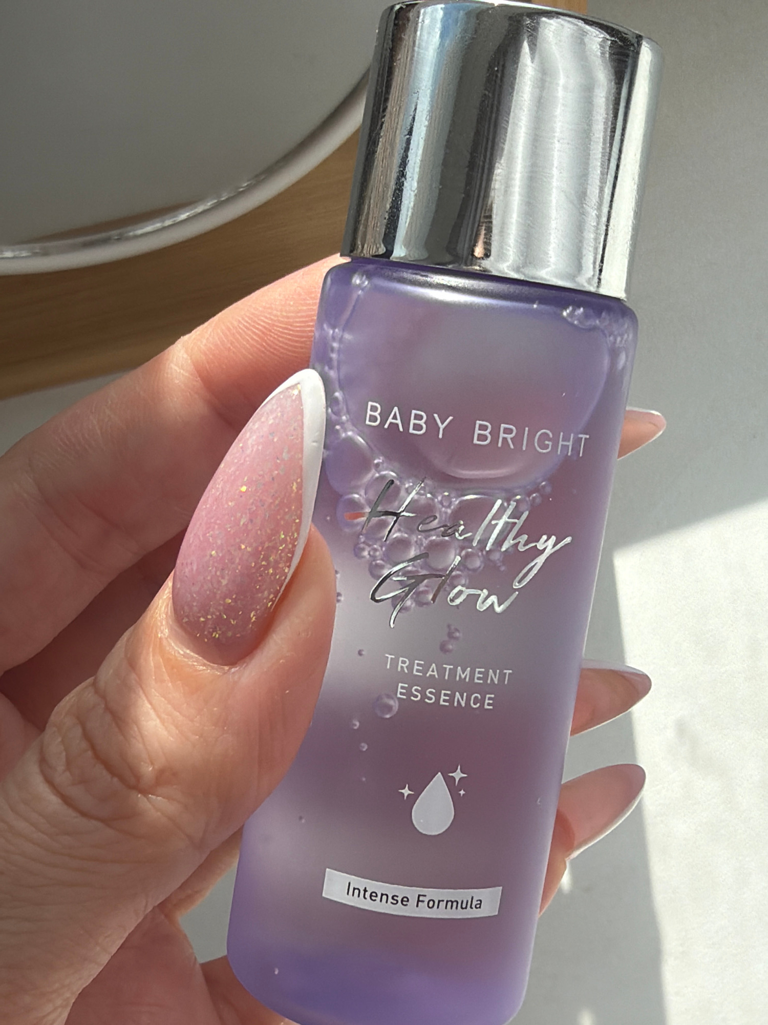 A light-skinned hand holds a bottle of "Baby Bright Healthy Glow Treatment Essence." The bottle is purple with a silver cap. The fingernails are long and oval, with a pink glitter base and a white Freβ¦read more