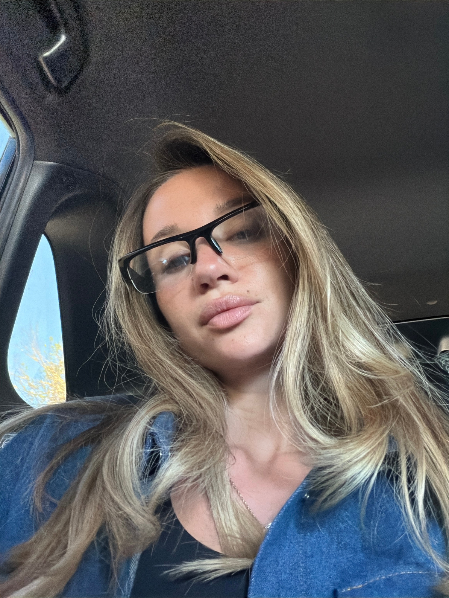 The image shows a woman with blonde hair wearing black glasses and a blue denim jacket. She is positioned in the interior of a car, with the black interior roof visible above and a glimpse of a blue s…read more