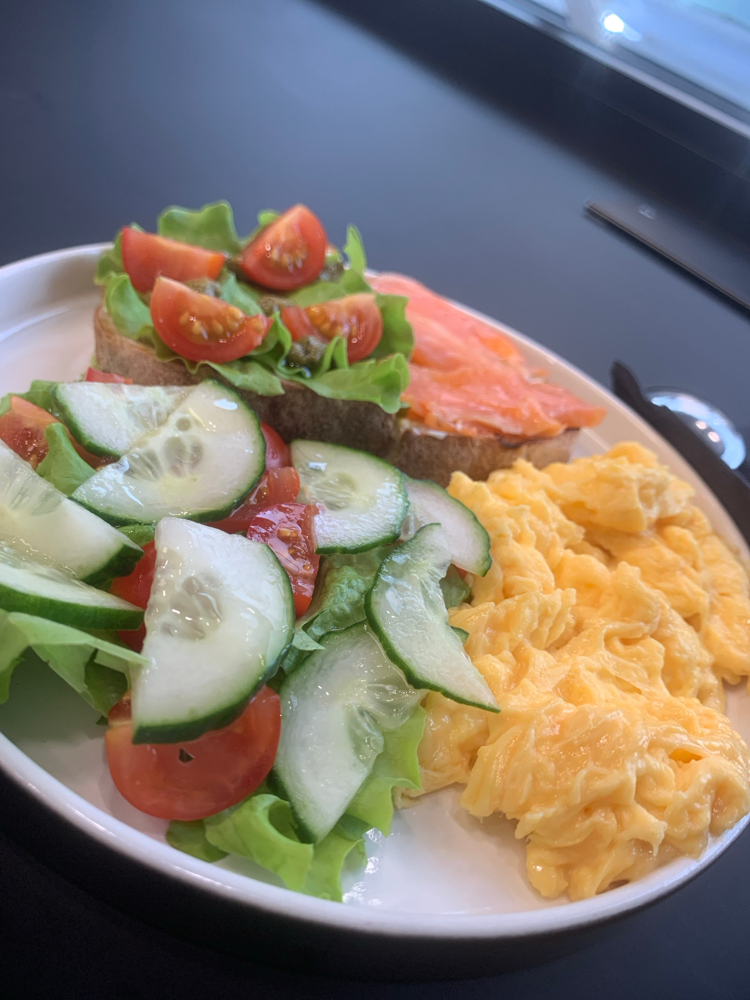 A plate of food is positioned on a dark, reflective surface. The food components include a pile of scrambled eggs, a slice of smoked salmon placed atop a piece of bread, and a salad consisting of lett…read more