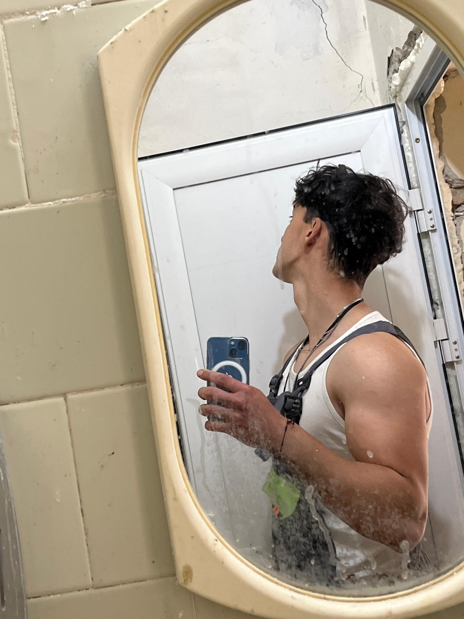 The image shows a person reflected in a bathroom mirror. The person is holding a phone and facing the mirror. They appear to be taking a photo of themself. The person has dark hair and is wearing a wh…read more