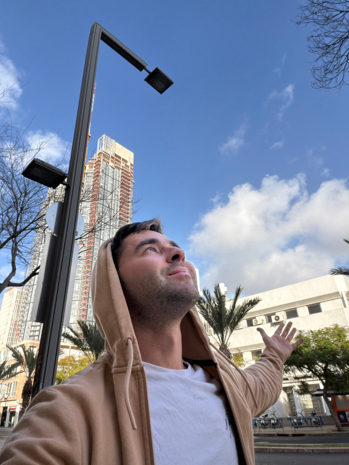 The image displays an urban scene in Tel-Aviv, Israel, specifically in an area consistent with the Sarona complex, under a bright blue sky with scattered white clouds. In the foreground, an adult maleβ¦read more