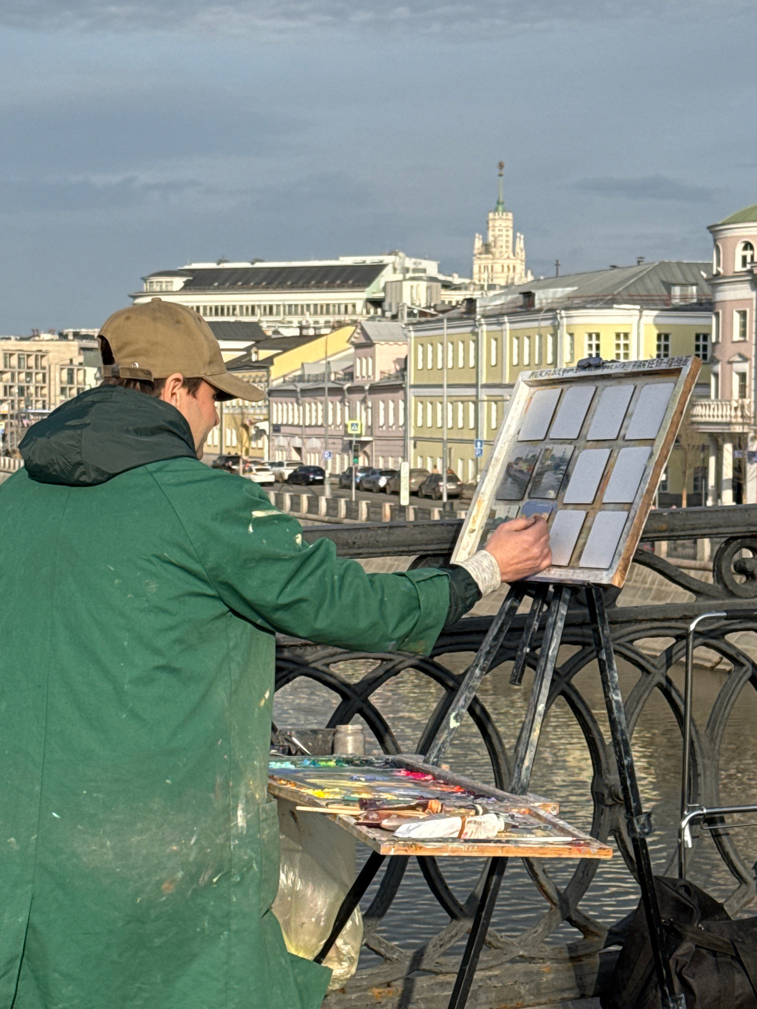 An individual, viewed from behind, is painting on a bridge over the Moskva River in Moscow, Russia. The person, appearing male, wears a brown baseball cap and a dark green, paint-stained long coat. Th…read more