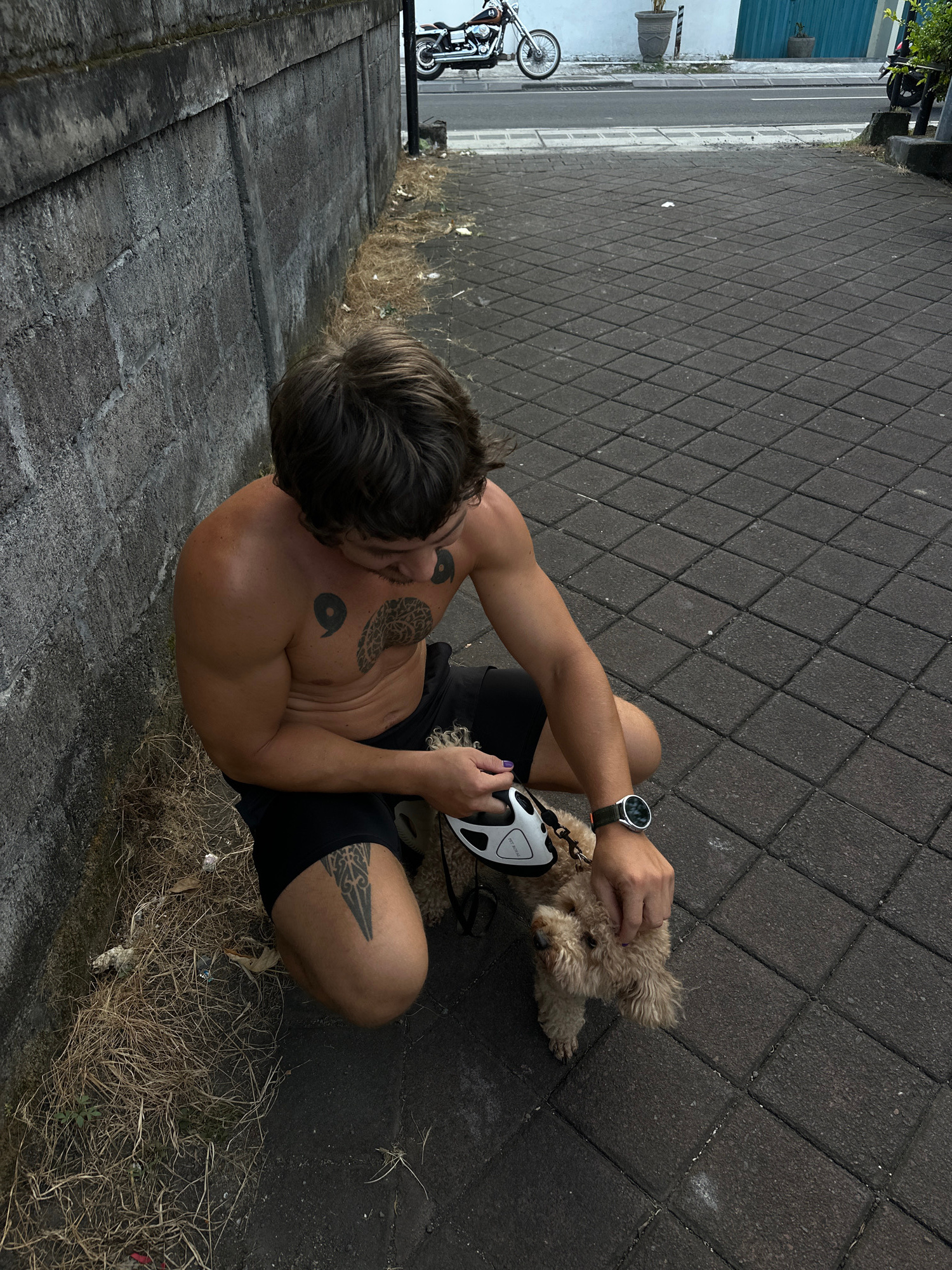An eye-level, rotated shot shows a shirtless man with dark hair, tattoos on his left chest, and right thigh squatting on a dark, gray, tiled walkway. He is facing away from the viewer and towards a sm…read more