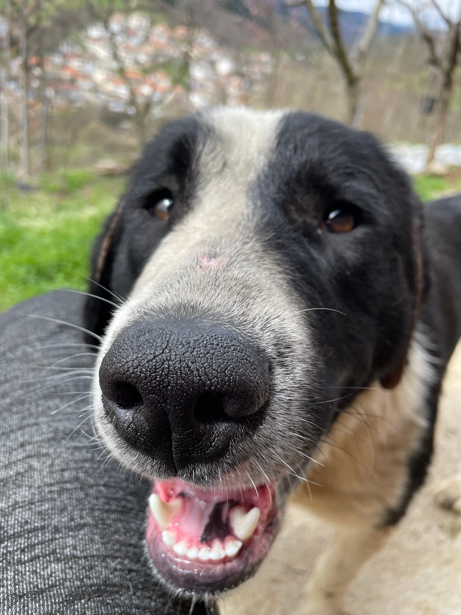 A close-up, rotated portrait shot of a black and white dog's face. The dog's nose dominates the foreground, with its whiskers partially visible. The dog's mouth is slightly open, showing its teeth. Th…read more