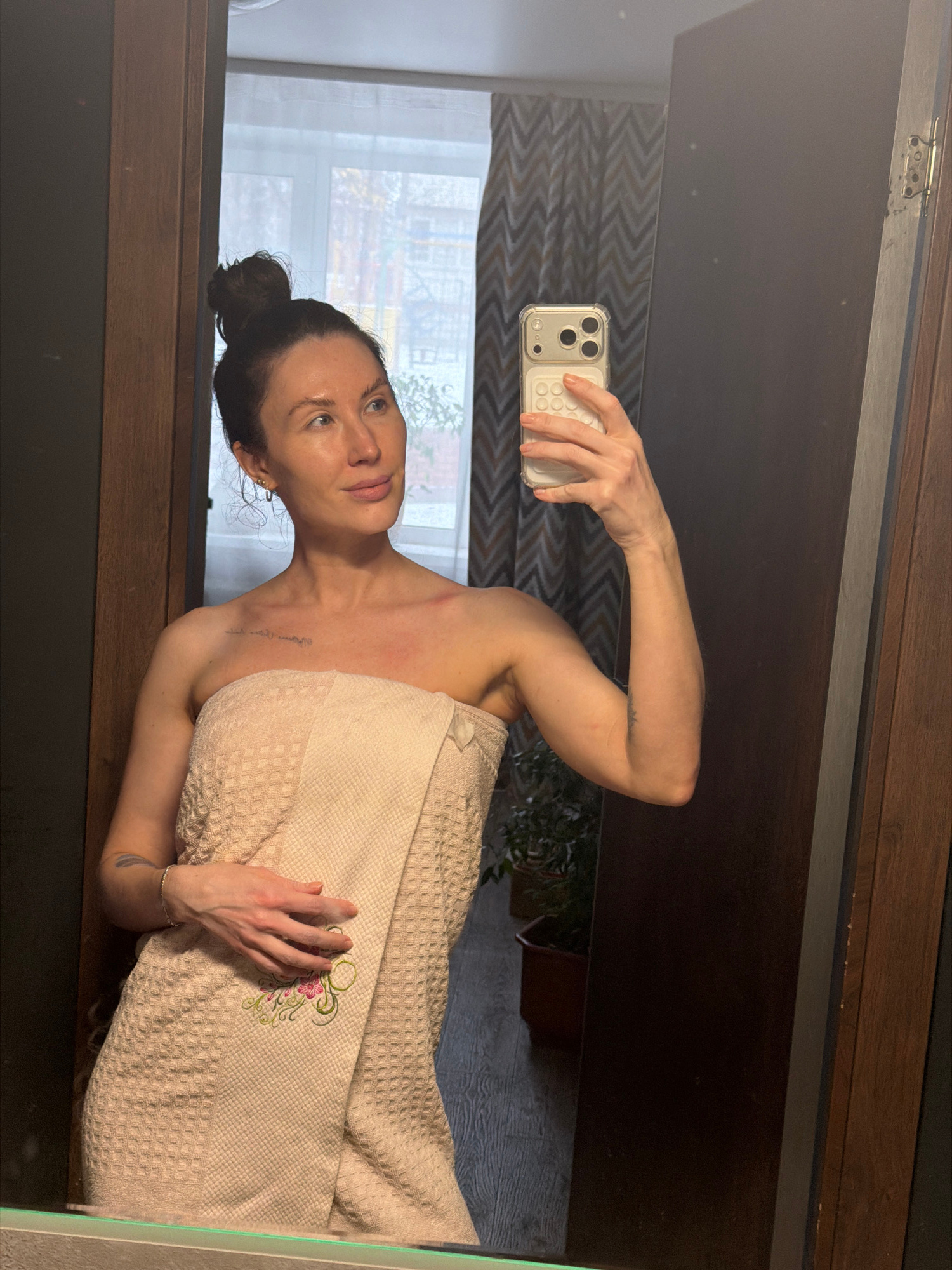 A woman stands wrapped in a cream-colored towel with floral embroidery, holding a smartphone in her right hand to take a selfie in front of a mirror. She has her dark hair pulled back into a bun and i…read more
