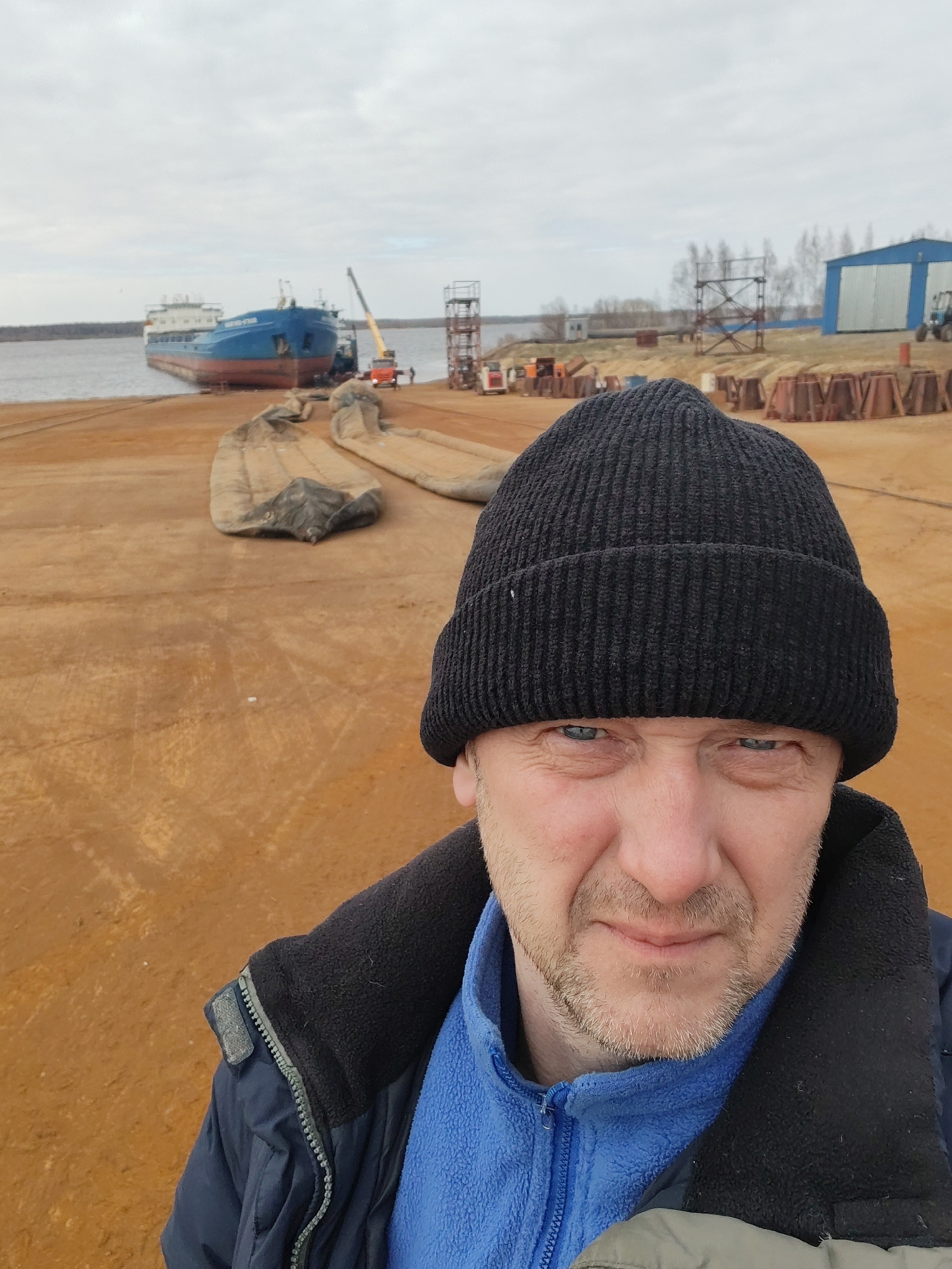 A man in a black knit cap and a blue fleece jacket is taking a selfie. He has fair skin, blue eyes, and short grey stubble on his face. The background shows an industrial riverside scene, likely a shi…read more