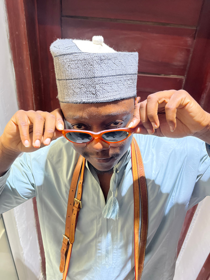 In the city of Joma, Ghana, a dark-skinned individual is depicted from the chest up, positioned against a dark reddish-brown background, possibly a wooden door or panel, with a lighter vertical elemen…read more