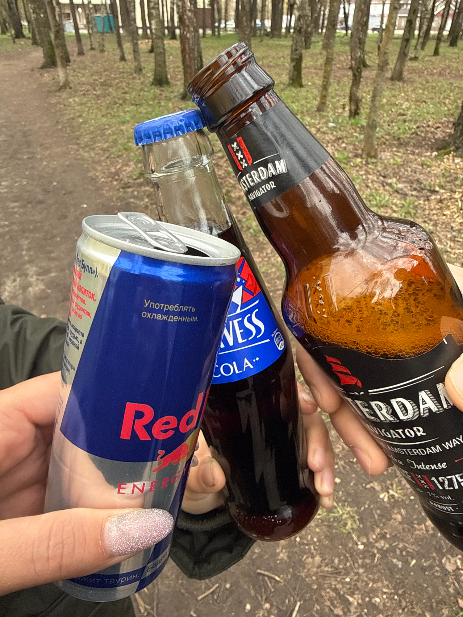 The image shows a collection of open beverages being held in someone's hands, possibly outdoors. The beverages include an open can of Red Bull, a glass bottle of Guinness Cola, and an open brown glass…read more