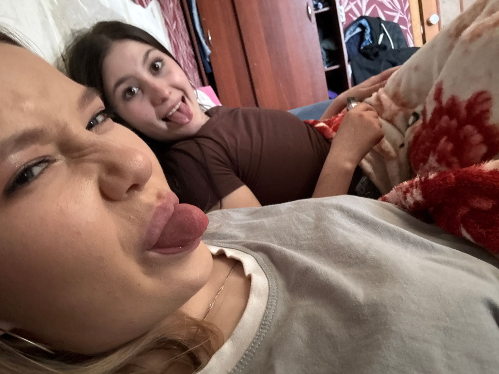 Two young women are posing in a selfie. The woman in the foreground is fair-skinned with blonde hair, and she is sticking out her tongue. She wears a light grey T-shirt with white trim. The woman in t…read more