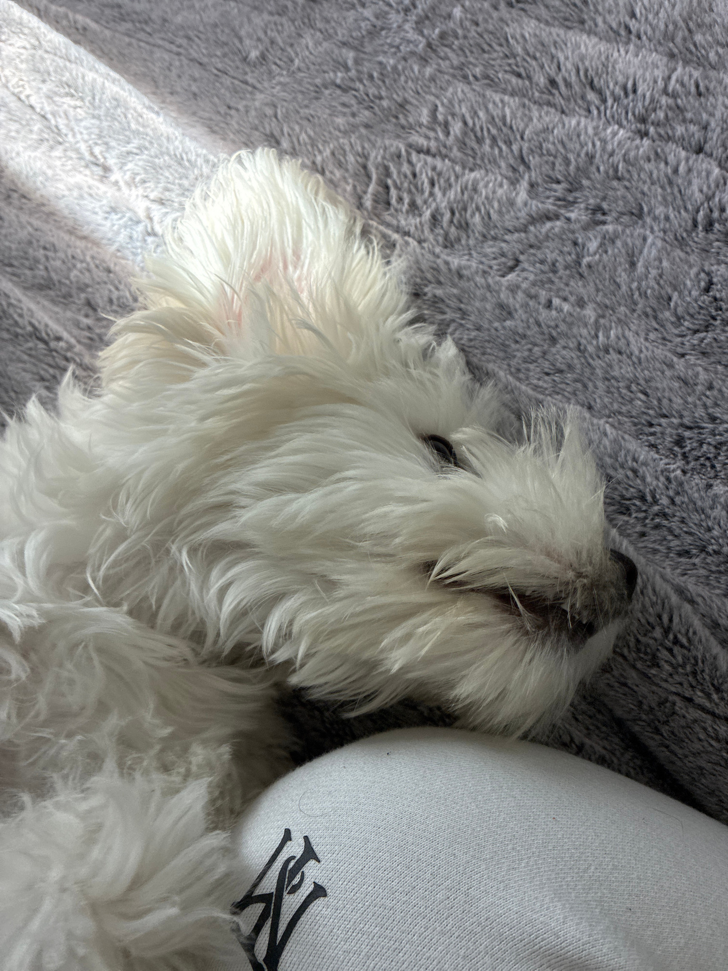 A white, fluffy dog is sleeping on a gray, fur-like blanket. The dog is positioned on its side, with its head resting against a white pillow or cushion. A black design is visible on the pillow.