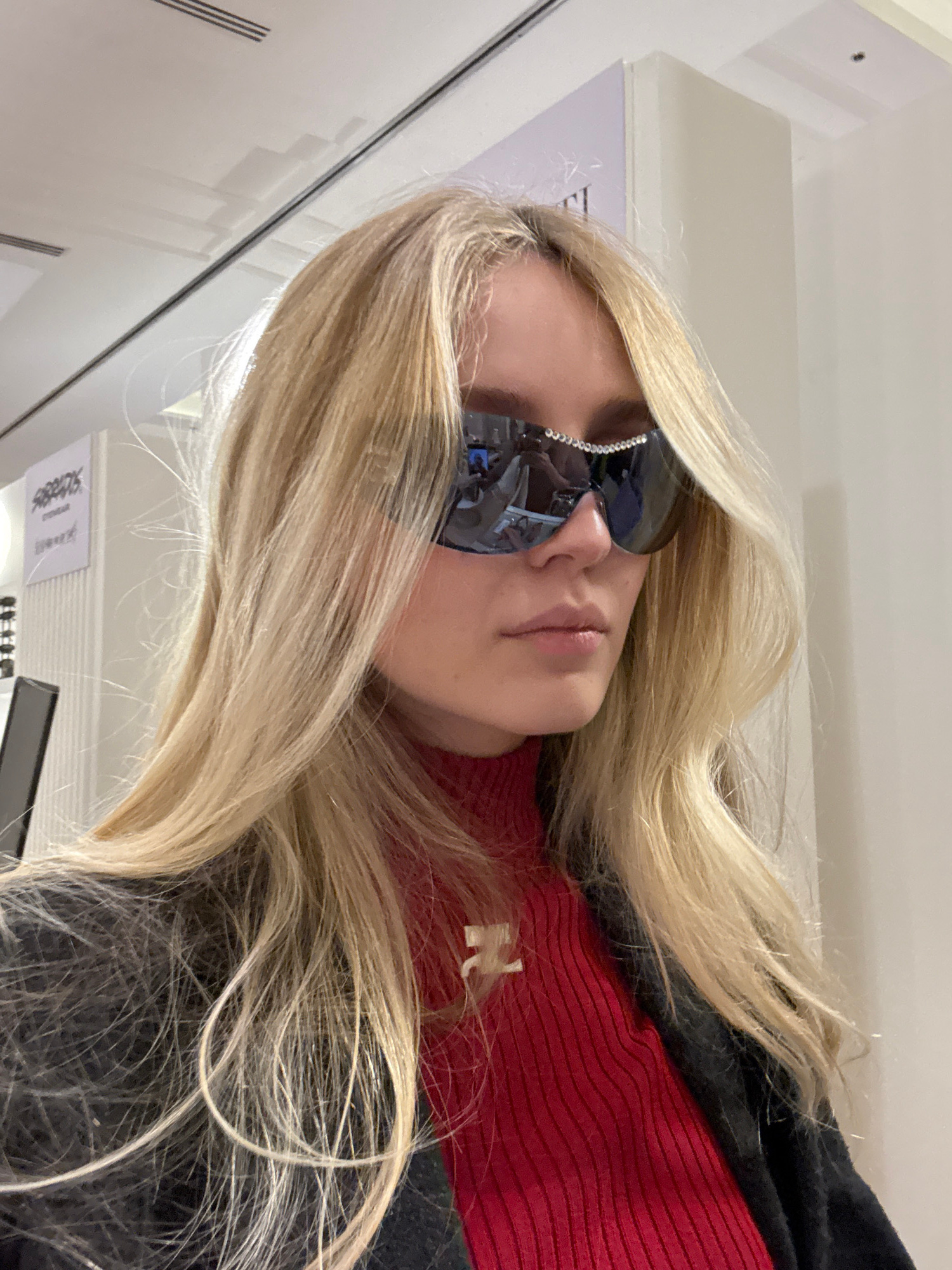 A woman with long blonde hair is wearing sunglasses with rhinestone embellishments. She is wearing a red sweater with a dark-colored top layer, likely a jacket or coat. The environment suggests an indβ¦read more
