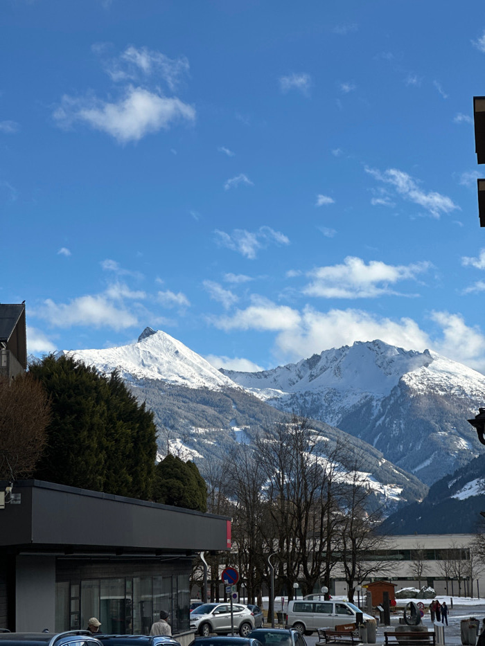 The image depicts a winter street scene in Bad Hofgastein, Austria, with snow-covered mountains dominating the background under a clear blue sky dotted with scattered white clouds. In the foreground…read more