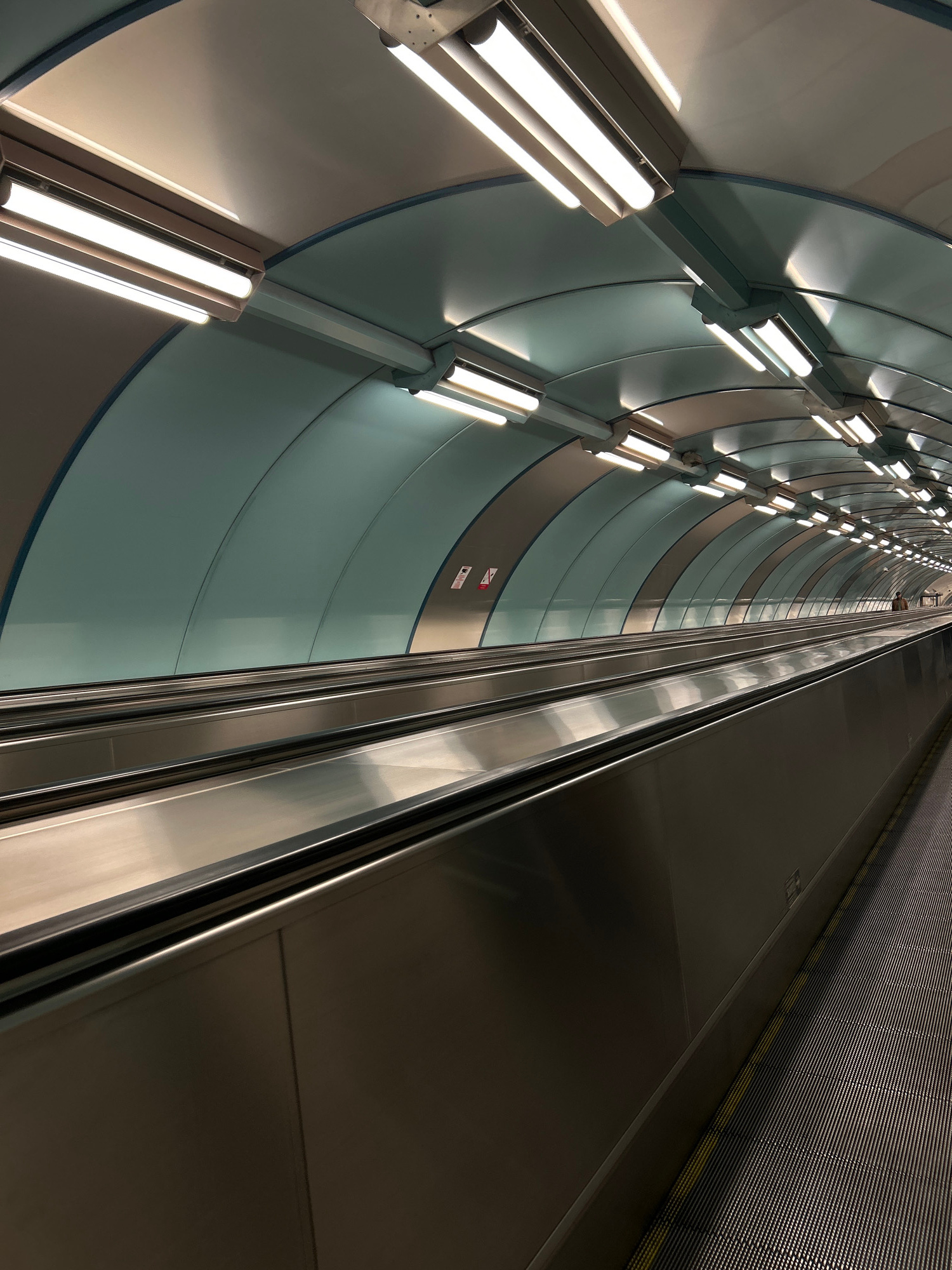 This image depicts a long, inclined travelator or escalator tunnel, likely within a modern public transportation hub such as a metro station in Shushary, Russia. The perspective is looking upwards alo…read more