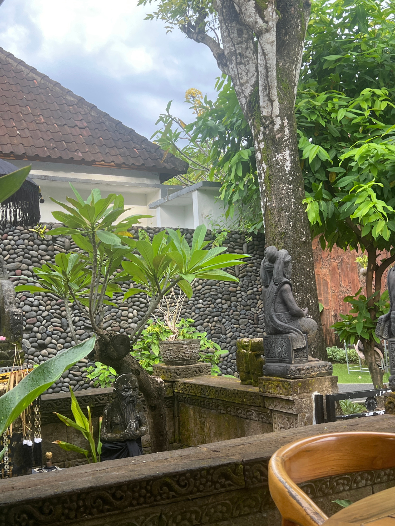 This image captures a serene outdoor scene, likely a garden or temple courtyard, rich with natural and architectural elements suggesting a tropical setting. The perspective is slightly angled, looking…read more